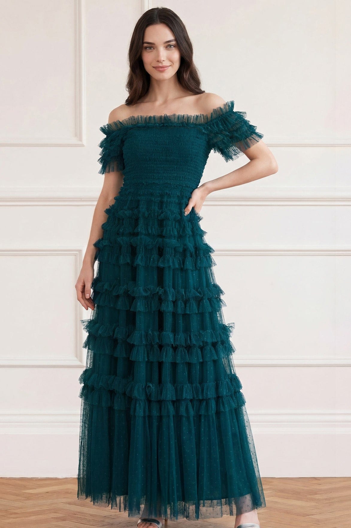 The Lisette Ruffle Off Shoulder Gown in Emerald. This statement gown has an elegant off-the-shoulder design inspired by Hollywood styling. Crafted with textile tulle and double-stitched frills for a dramatic, romantic effect. Features an integrated corset for a perfect fit and to hold the silhouette. Expect all eyes on you in this romantic gown.