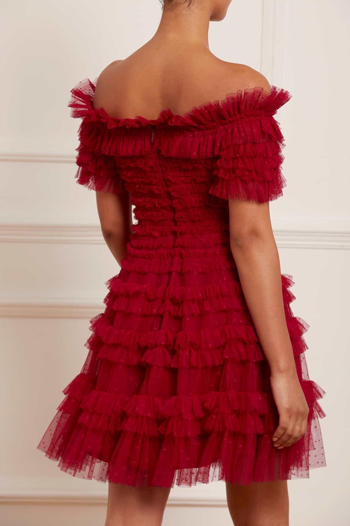 The Lisette Ruffle Off-Shoulder Micro Mini Dress in Deep Red. This statement dress has an elegant off -the-shoulder design inspired by Hollywood styling. Crafted with textile tulle and double-stitched frills for a dramatic, romantic effect. Designed with an integrated corset for a perfect fit and to hold the silhouette. Expect all eyes on you in this romantic dress.