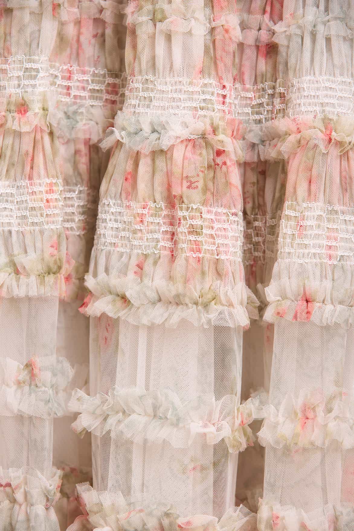 NEW SEASON: The Madame Rose Elodie Off-Shoulder Ankle Gown in Moonshine. This luxurious gown features an archive-inspired rose print, with an off-shoulder neckline framed by layers of gathered ruffles for a romantic, frothy effect. The linear smocking design, intricately embroidered and interspersed with signature Needle & Thread tulle frills, graduates beautifully towards the sweeping hem, enhancing the gown's stunning silhouette. The skirt, crafted from layers of delicate net and tulle, flows with graceful movement. An internal stretch power-mesh corset provides exceptional comfort and fit, while soft boning, encased in grosgrain ribbon, adds exquisite couture detailing. Elastic trim and adjustable hook-and-eye fastenings ensure a versatile and perfect fit.