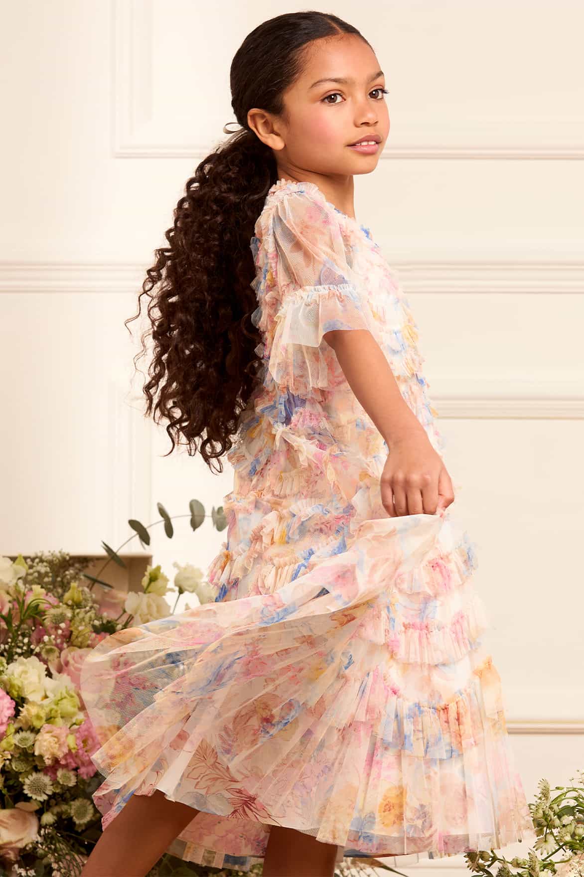 NEW SEASON. The Mariannes Floral Scallop Ruffle Kids Dress in Moonshine features a vintage-inspired print by Victorian botanical artist Marianne North. Crafted with scalloped borders and gathered frills, it captures the signature Needle & Thread style—perfect for picnics, birthdays, and warm-weather getaways.