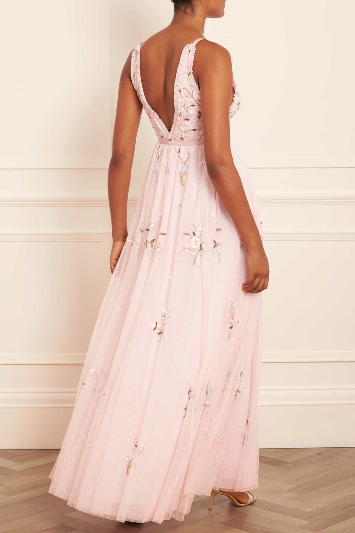 The Petunia Cami Gown in Peony Pink. Inspired by Edwardian vintage artwork, this elegant gown is designed with rich embroidered bouquets of delicate florals in soft, pastel shades and subtle, vibrant green highlights. Shimmering iridescent sequins scattered throughout add a glistening effect to the piece. Intricately cut with fine, delicate tulle ruffles trimming the neckline and a voluminous skirt that features a net under layer to hold the shape and create a romantic silhouette. The ultimate fairytale style.