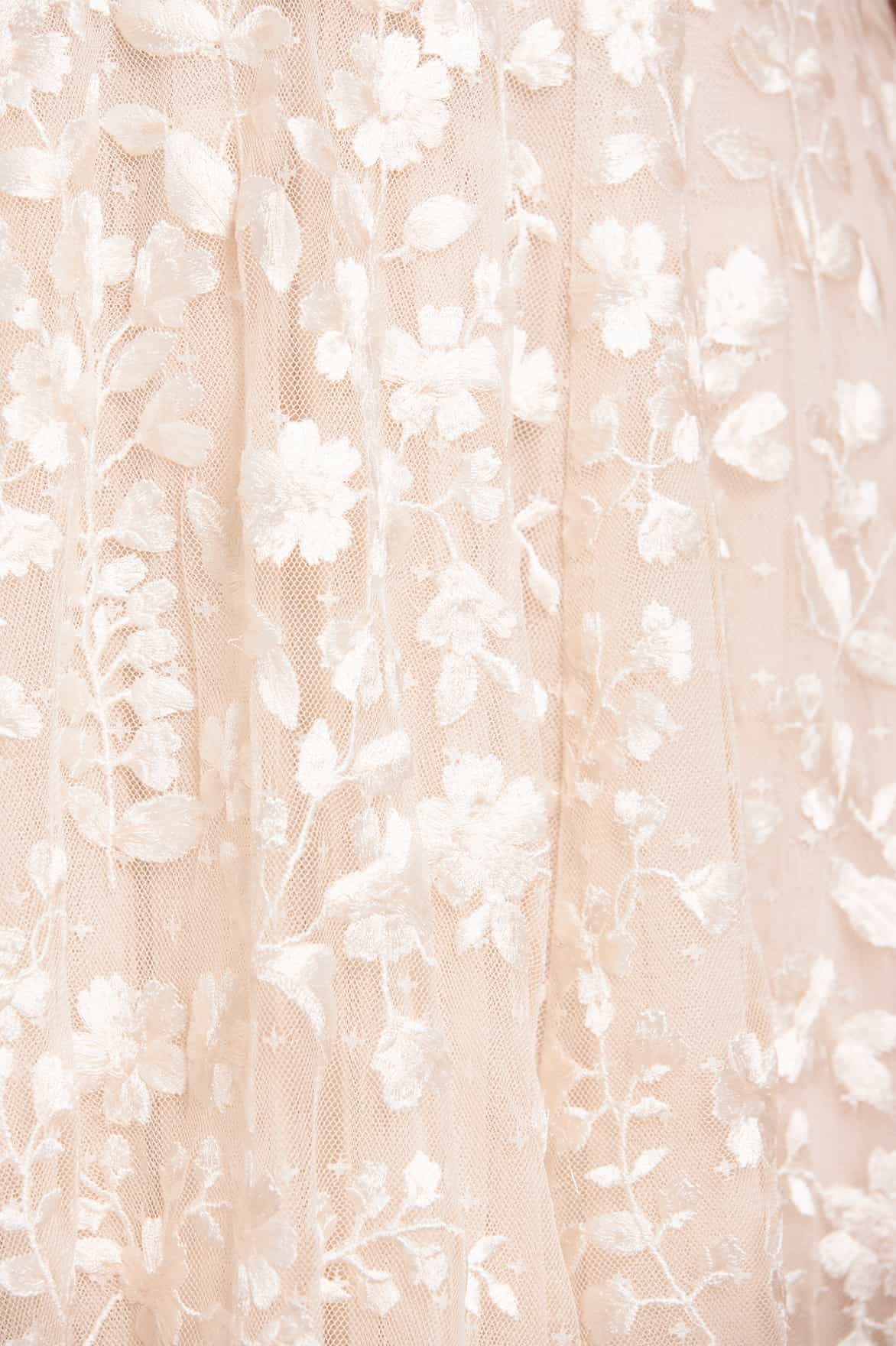 NEEDLE & THREAD EXCLUSIVE.The Posy Pirouette One-Shoulder Ankle Gown in Cream/Pink. A romantic statement style for the season. Beautifully embroidered with intricate posy florals that scatter across the gown and gently disperse towards the hem, this design is developed with an elegant one-shoulder neckline. Soft tulle ruffles add movement and texture, while the voluminous skirt creates a sweeping, ethereal silhouette.