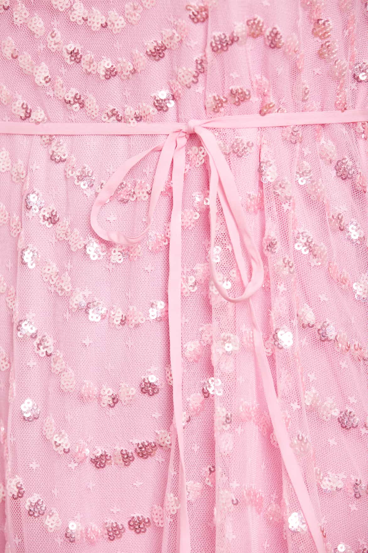 NEW SEASON. The Shimmer Wave Gloss One-Shoulder Micro Mini Dress in Blossom Pink. This mini dress is developed with a one-shoulder design and a generous, voluminous sleeve for elegant detail. Adorned with a shimmering artwork in high gloss sequins. This style is inspired by the sea waves of the Riveria, featuring delicate sequins creating undulating borders for a romantic, glistening effect. The skirt is made up of layers of signature Needle & Thread soft tulle. A Needle & Thread season favourite.