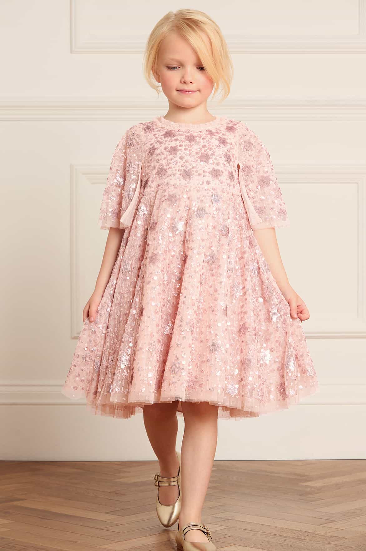 The Shooting Stars KIDS Dress in Pink/Rose Gold. This dress is inspired by the extravagant costumes worn by the Follie’s dancers of the early 1900s. Beautifully decorated with embellishments of intricate star motifs, with clusters of tiny sparkling sequins that scatter towards the hem, creating a shimmering effect. The dress is adorned with signature Needle & Thread tulle ruffles and frills. The skirt features generous layers of net and tulle with a sweeping hemline, perfect for twirling. The loose-fit silhouette ensures easy-to-wear styling. This dress captures the magic of fairytales and the beauty of the night sky.