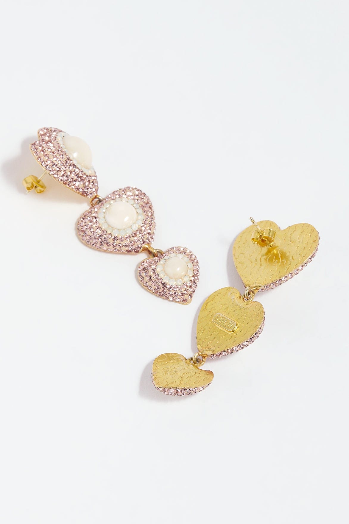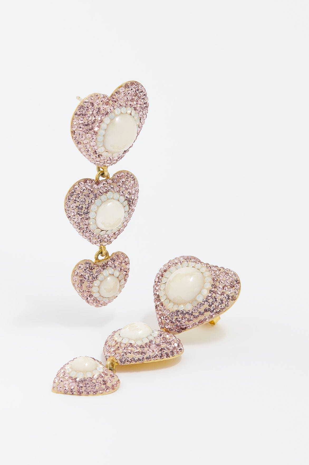 The Sweetheart Blossom Drop Earrings in Blossom Pearl. A petite version of Soru’s signature 3-tier heart earrings for the Needle & Thread x Soru collaboration. These handmade statement earrings are 18kt gold plated silver, encrusted with blossom pink micro crystals and an iridescent Majorca pearl centre. Beautifully designed in a soft pink colourway for a feminine look. The perfect earrings for any RSVP.