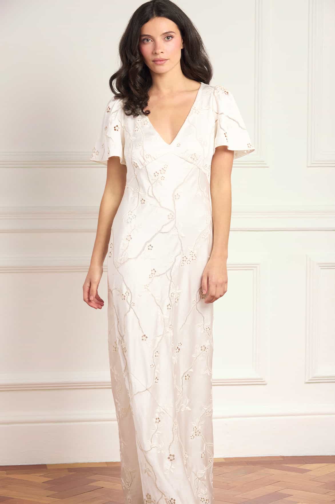 NEW SEASON. The Cherry Blossom Satin Short Sleeve Gown in Cream. An exquisite satin gown embroidered with a trailing cherry blossom motif inspired by romantic archive florals. Designed with softly fluted short sleeves and cut on the bias for a smooth, flattering fit. Ideal for summer occasions and elegant evening events.