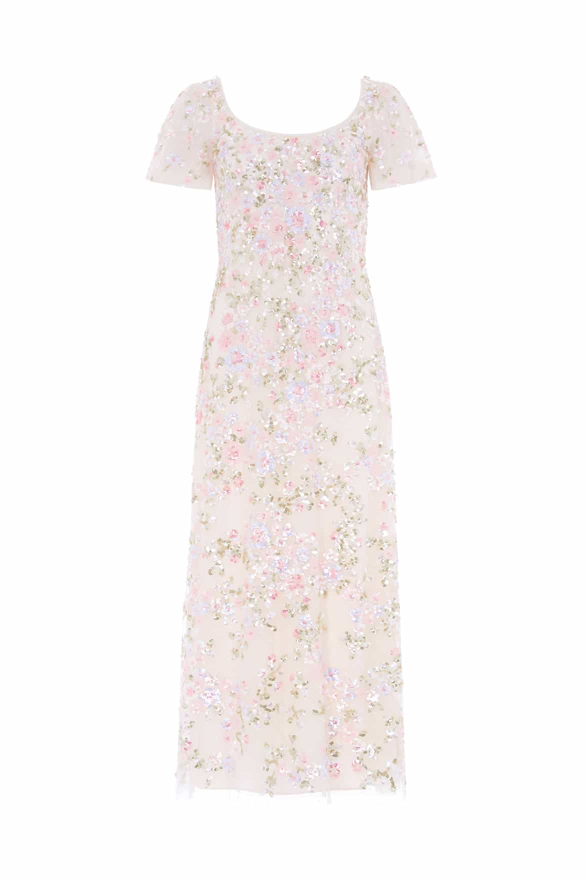 NEW SEASON. The Dream Garland Puff Sleeve Ankle Gown in Cream/Multi. Adorned with intricate floral embellishment, inspired by vintage embroidery. Designed with softly gathered puff sleeves and a full tulle skirt, this gown exudes refined romance and timeless elegance.