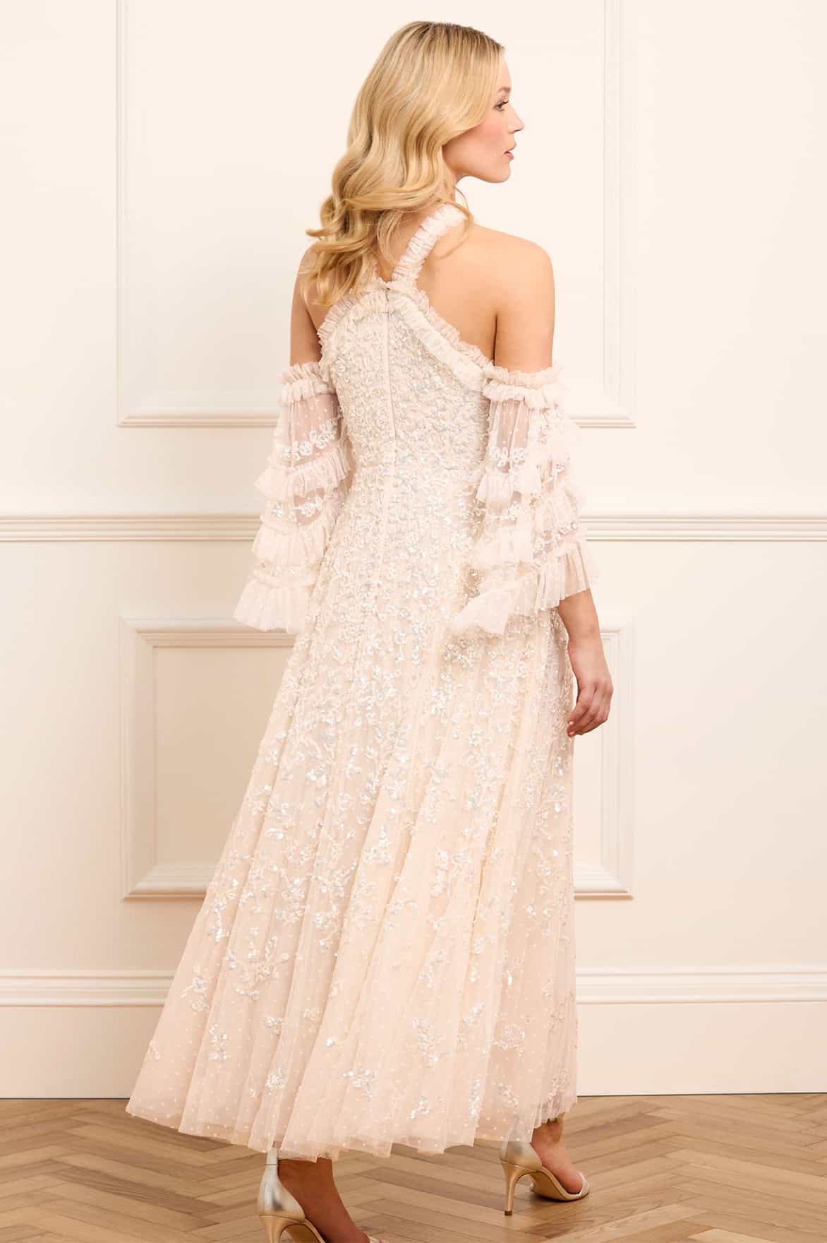 The Floral Lace Off-Shoulder Ankle Gown in Cream. This beautiful dress is embellished with tiny sequins in an overlapping linear formation depicting an exquisite floral design inspired by vintage lace from the early 1900s. The statement off-the-shoulder design has a flattering curved neckline and straps, adorned with signature Needle & Thread soft tulle ruffles. The fluted sleeves are decorated in frothy tulle ruffles and adorned with glittering sequins in floral motifs. The skirt is made up of generous layers of net and tulle with sweeping hemline. The perfect statement style for a special occasion.