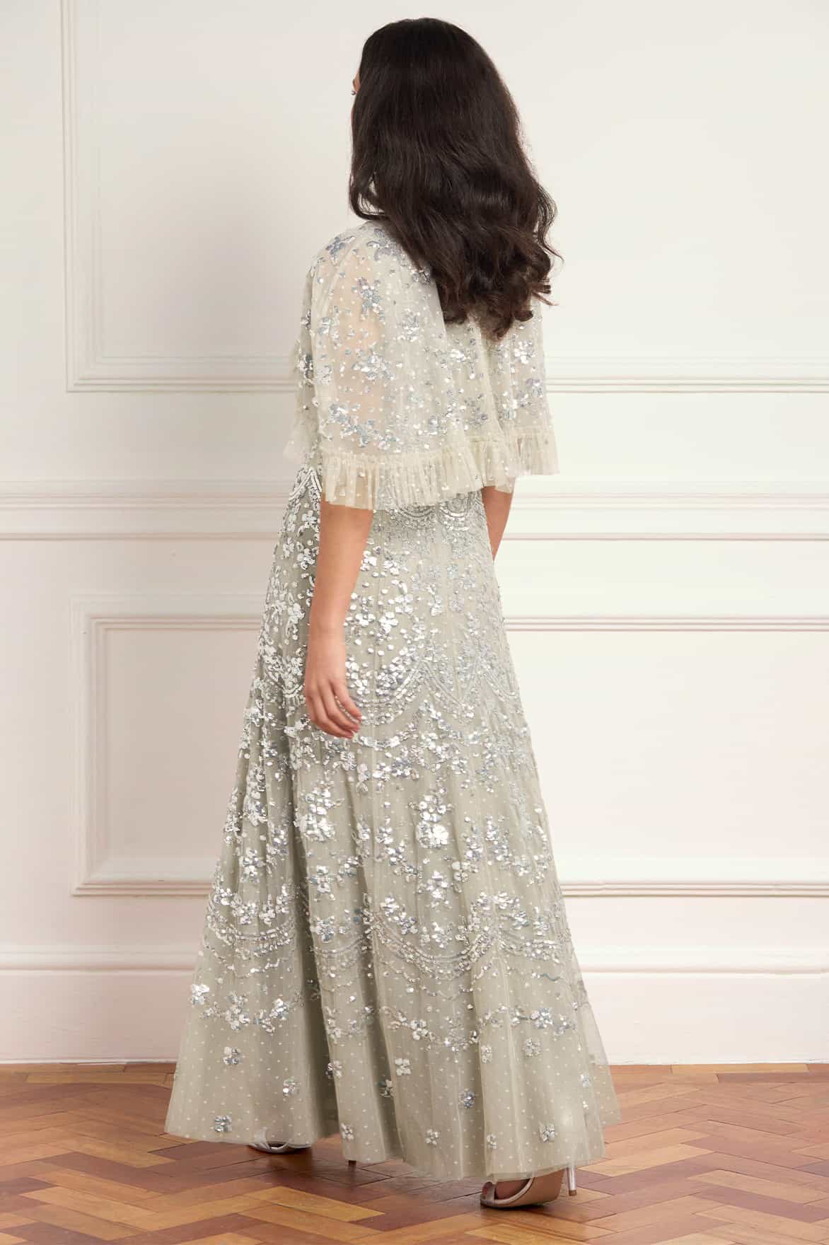 NEW SEASON. The Freya Cape Ankle Gown in Seafoam. Adorned with exquisite Freya embellishment inspired by antique lacework, this ankle gown features intricate floral borders and softly scalloped detailing. Designed with flowing cape sleeves and a flattering silhouette, the high-gloss sequins gradually fade toward the hem for romantic movement.