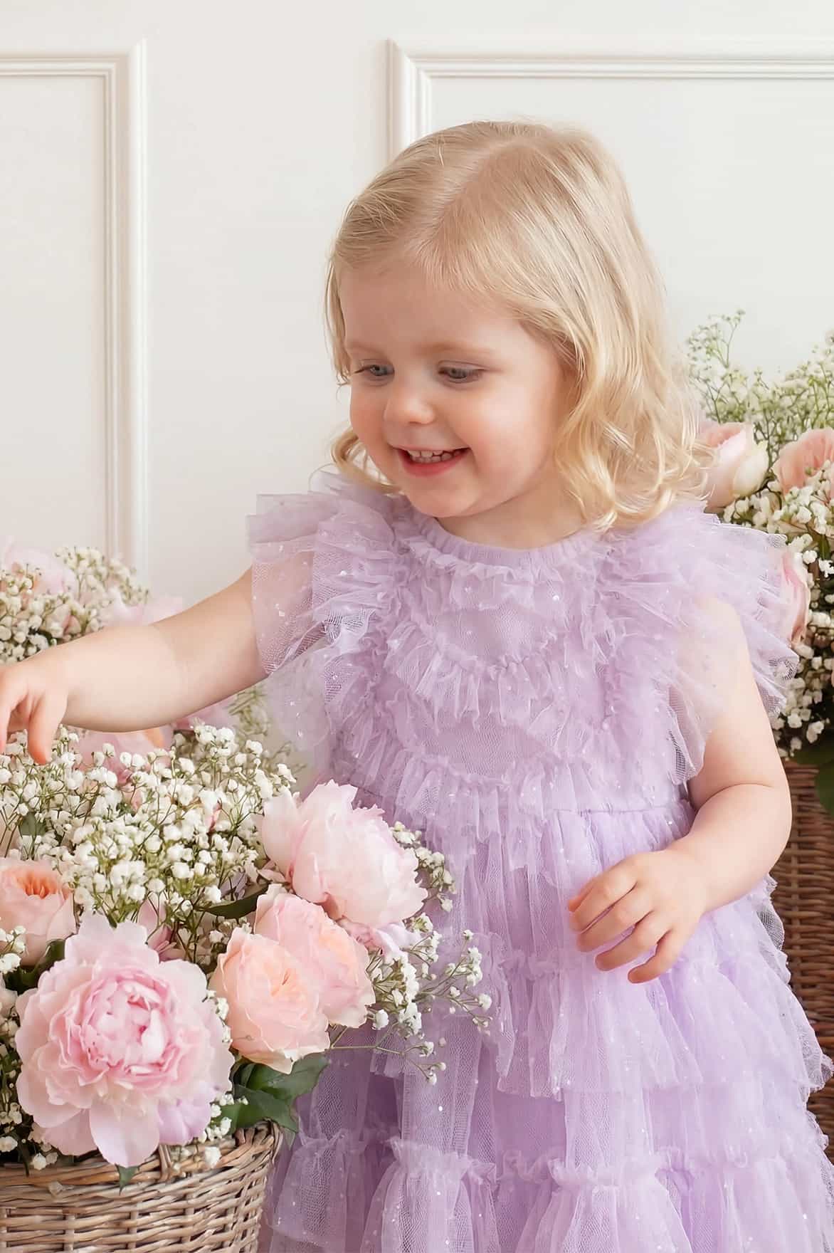 NEW SEASON. The Genevieve Baby Dress in Lilac Pearl. Decorated with intricate floral embroidery in soft pastel tones. Designed with a floaty silhouette and a gentle drape, it’s an enchanting piece for special occasions.