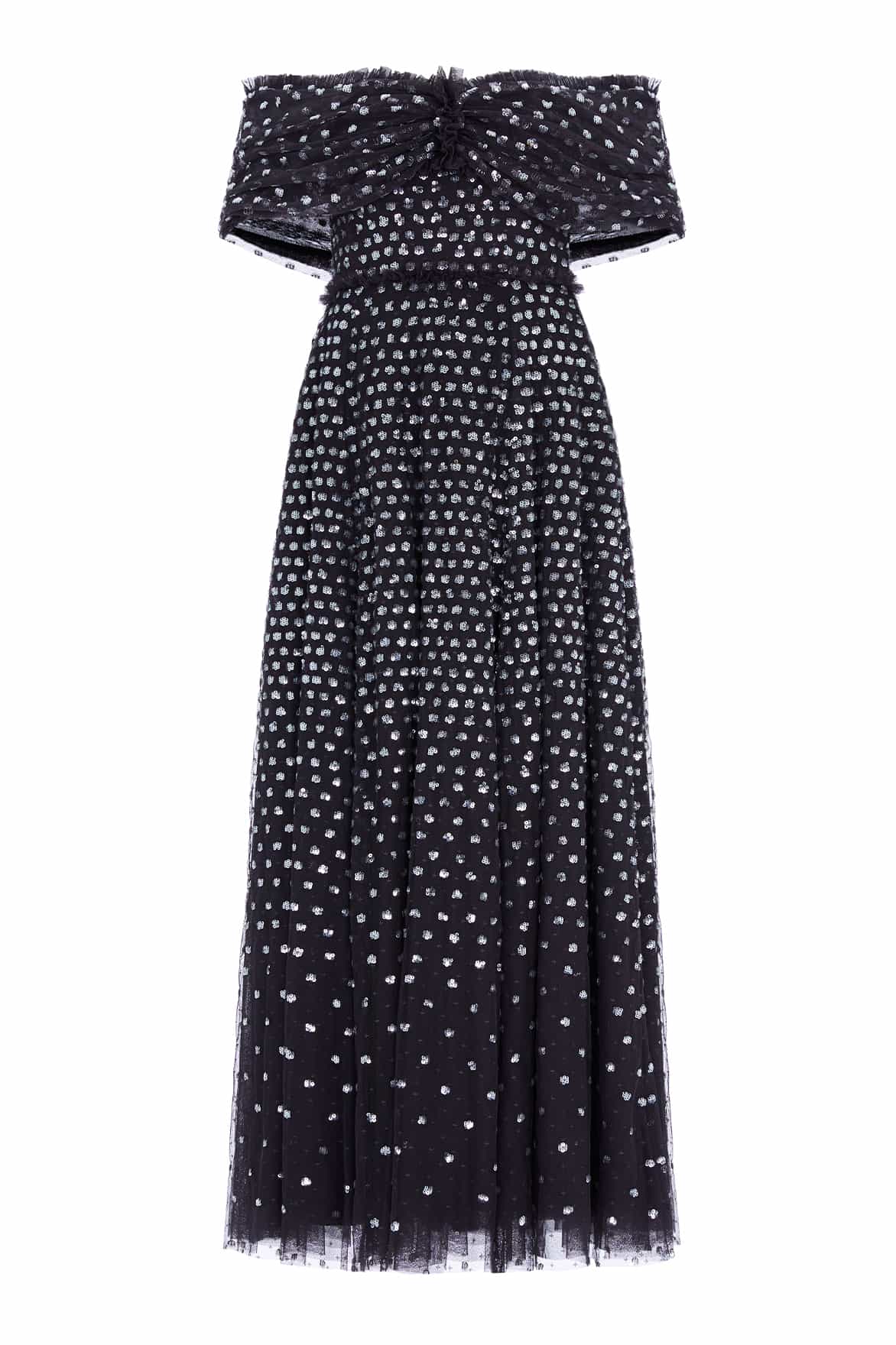 The Grace Gloss Off-Shoulder Ankle Gown in Graphite / Silver. This gown is beautifully decorated with high-shine sequins in dot motifs creating an enchanting, shimmery effect. Crafted with an off-the-shoulder design inspired by iconic Grace Kelly, capturing the elegance of her look perfectly. Designed with an integrated corset for the perfect shape and structure. You'll forever treasure the Grace Gloss.
