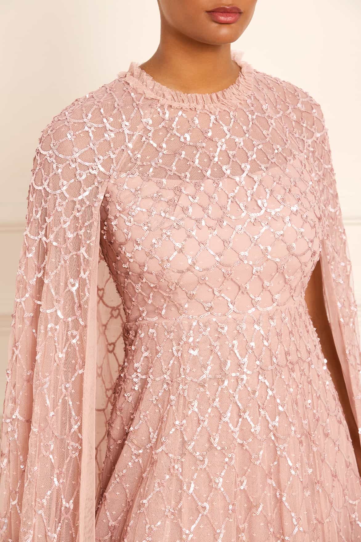 The Heart Lattice Ankle Gown in Rose Gold. This gown is decorated with intricate embellishments made using the smallest sequins for exquisite detailing. Beautifully designed with heart-shaped motifs in a lattice layout. This gown features our new floor-length cape for romantic detailing and a statement look. Make an entrance at your next event.