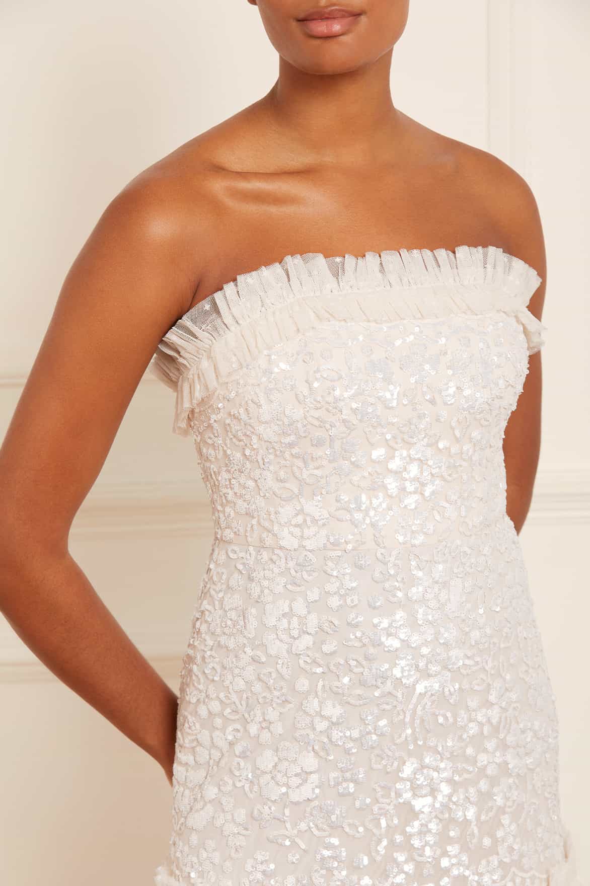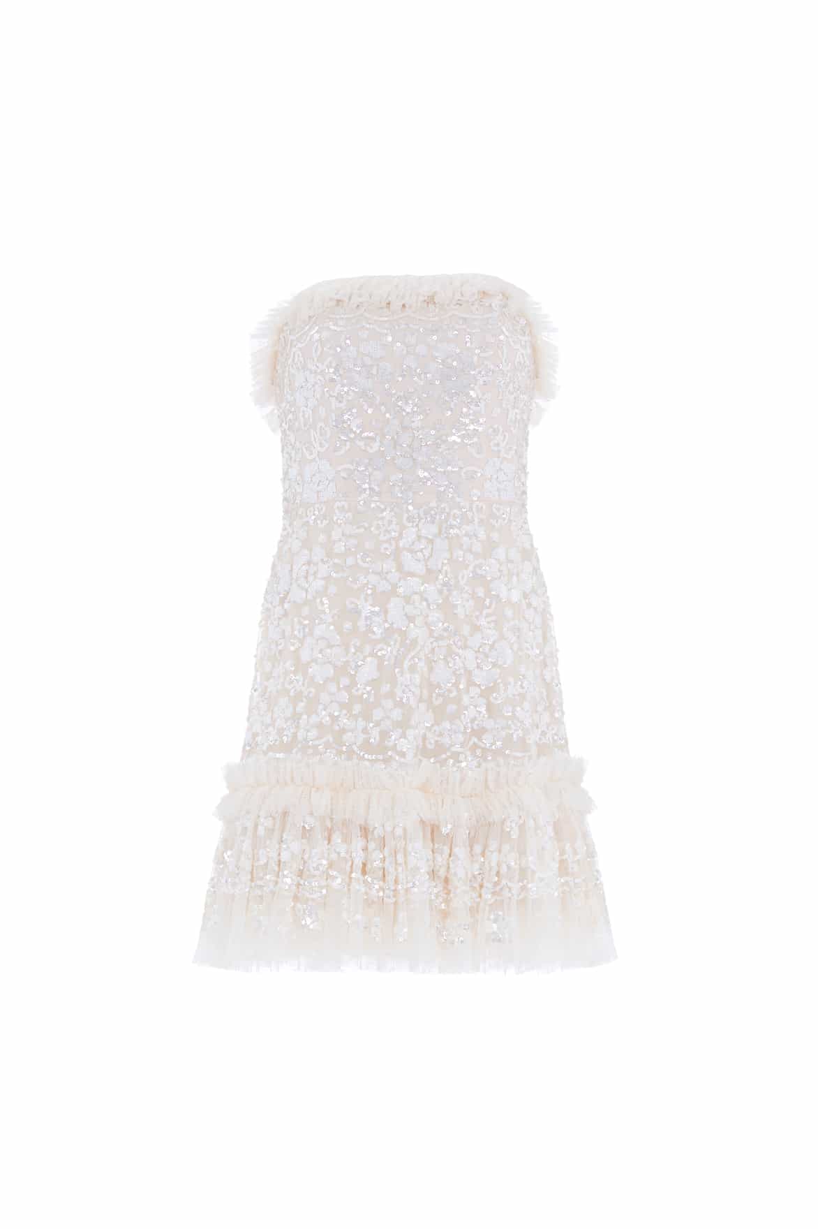The Regal Rose Gloss Strapless Micro Mini Dress in Cream. The Regal Rose is decorated with elegant, floral artwork featuring delicate lace. This dress is developed with a fitted corset bodice and then flows into a dramatic, voluminous skirt. The integrated corset is made with ribbon stitching, soft boning and panels of stretch mesh fabric for comfort and security in the fit. The perfect dress for a special moment.