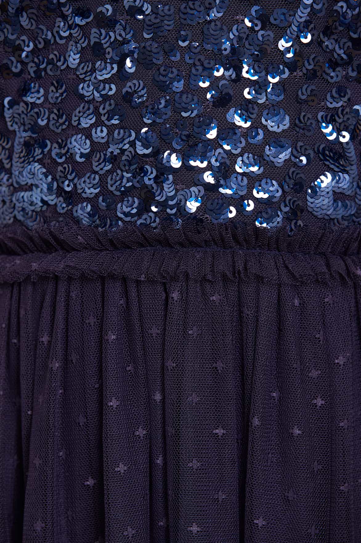 The Sequin Wreath Bodice Halter Neck Ankle Gown in Navy. This beautiful gown is crafted with an elegant halter neck shape and backless design. Designed with a signature Needle & Thread layered tulle skirt and tulle frills. The bodice of the gown is adorned with rich, shimmering sequins in a floral artwork. Shine under the spotlight in this magical style.