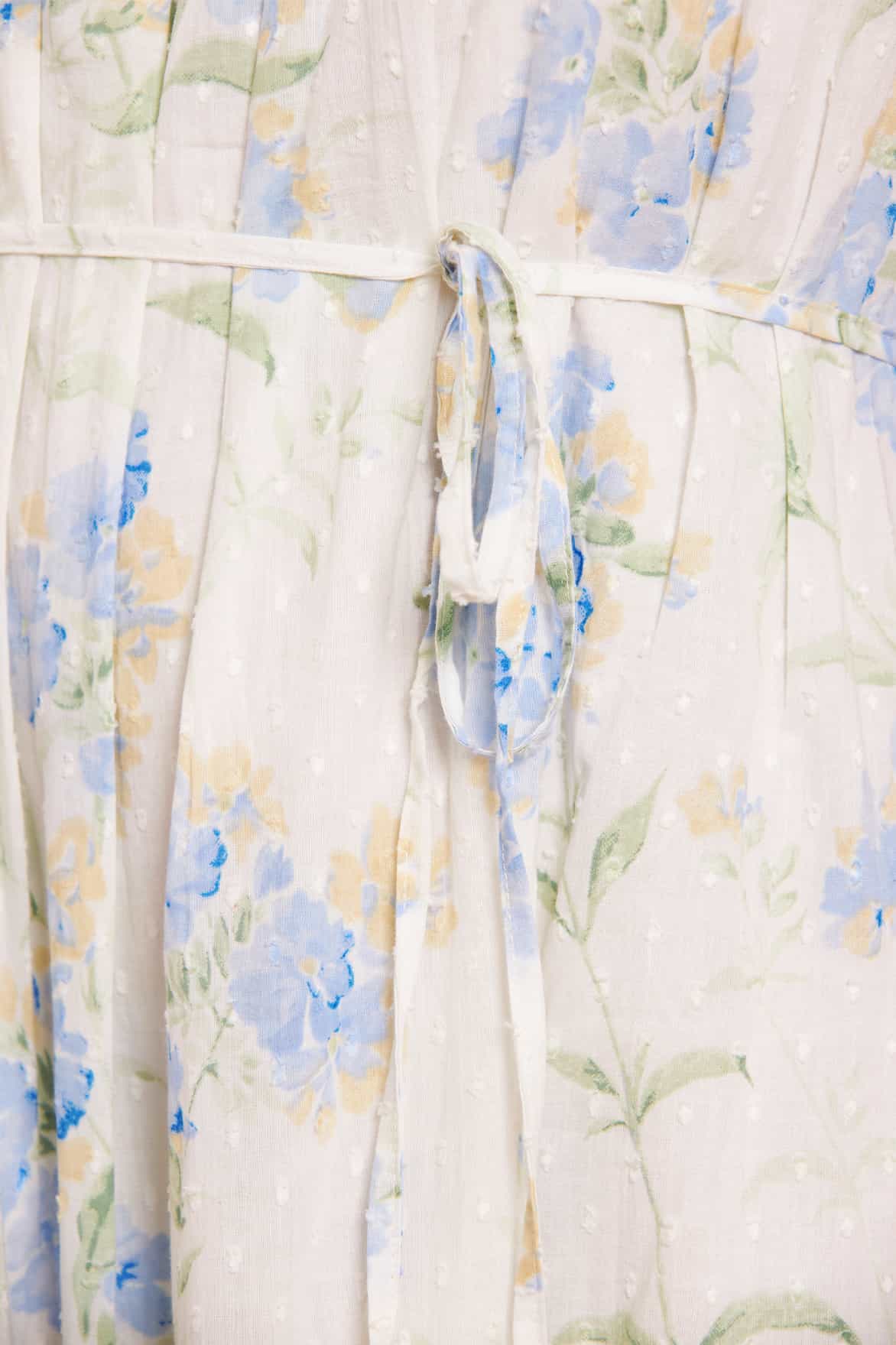 - Organic textured cotton decorated with floral print and cotton ruffles