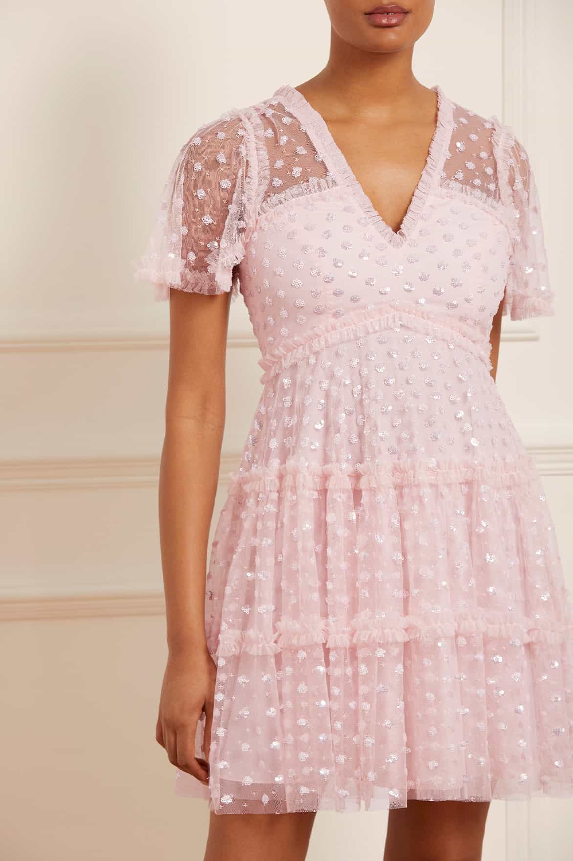 The Thea Mini Dress in Dusk Pink. This mini dress is scattered with polka dot sequin motifs to create an enchanting shimmer throughout. Developed with signature Needle & Thread 'x' motif tulle adding subtle detail. Make a special appearance in the Thea at your next event.