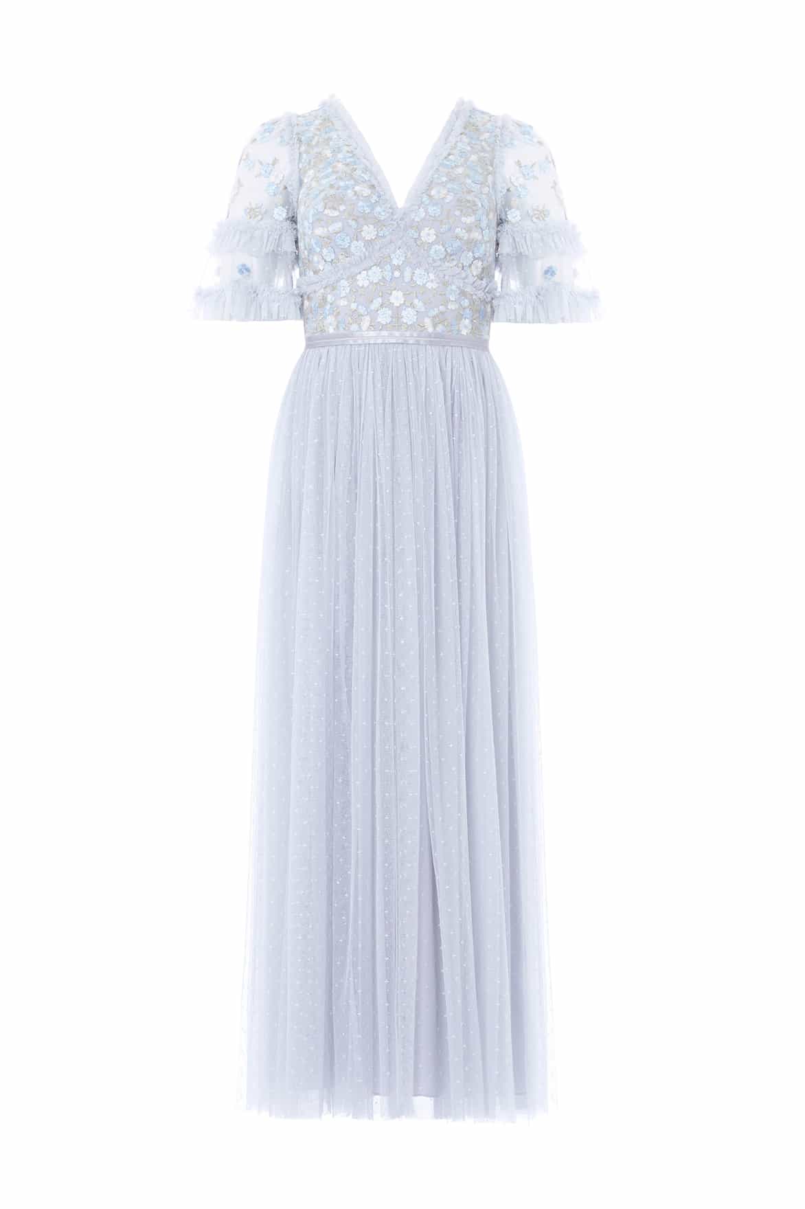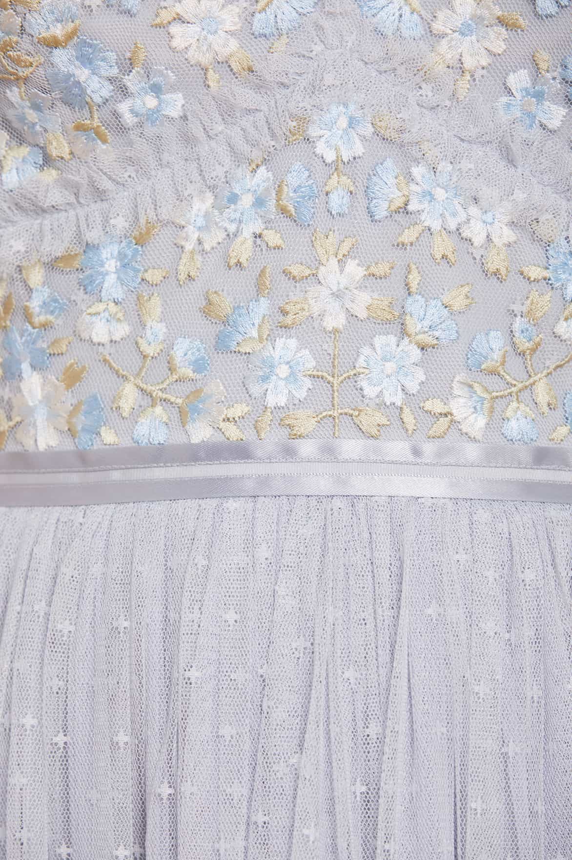 The Wildflower Ditsy Bodice Ankle Gown in Cornflower Blue. The bodice of this dress is designed with intricate, floral embroidery in soft pastel shades in the most romantic colour palette. Designed with a statement skirt featuring layers of tulle net to create dramatic volume. The Wildflower is perfect for an upcoming special occasion.