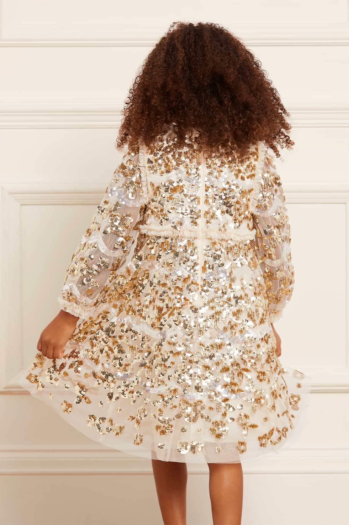 The Alicia Sequin KIDS Dress in Champagne / Gold. This KIDS style features signature Needle & Thread details. Beautifully designed with high-impact, lustrous sequins creating an all-over shimmering effect. This KIDS dress has intricate artwork featuring floral and scallop shape motifs cascading down the dress. Let your little one shine at her next event.