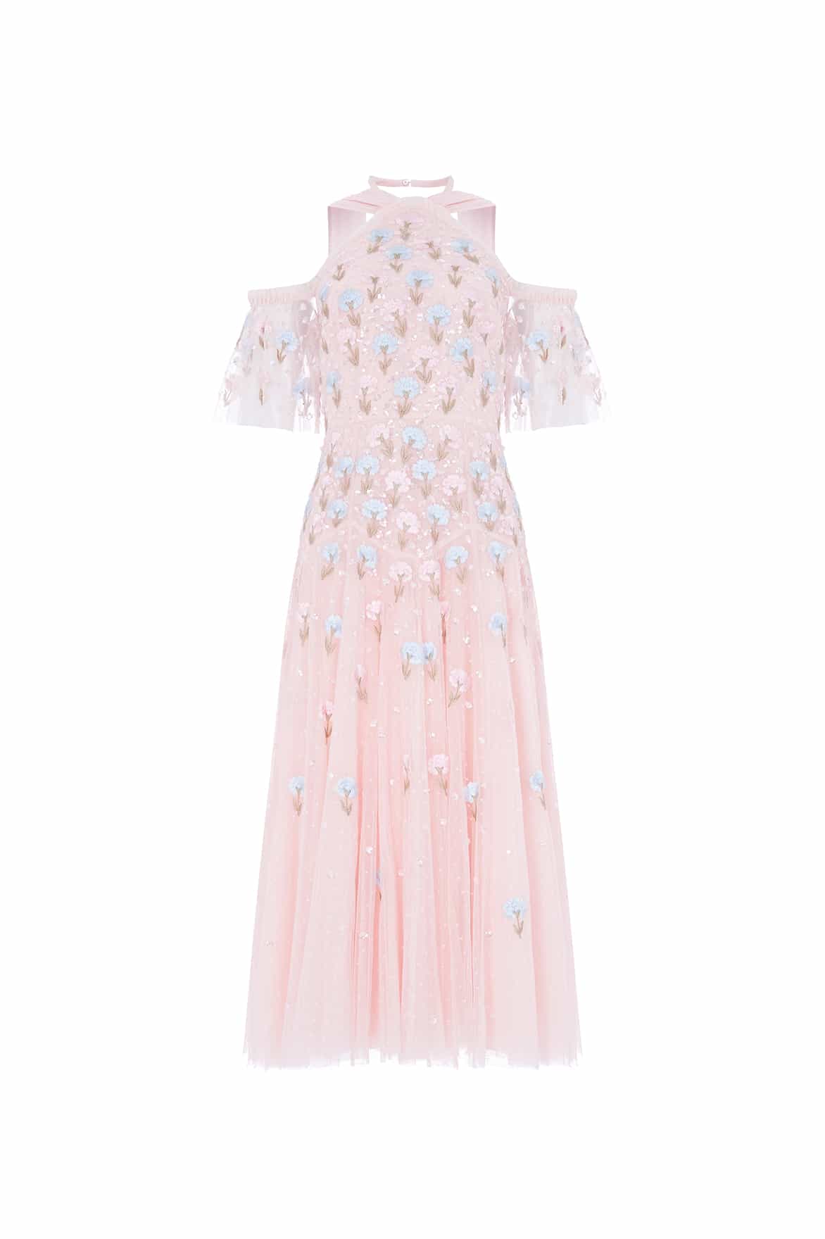NEW SEASON. The Dandelion Ditsy Halter-Neck Ballerina Dress in Seashell. Showcases embroidered dandelion motifs in soft pink and blue tones. With its halter neckline and layered tulle ballerina skirt, this piece exudes whimsical romance and graceful movement.