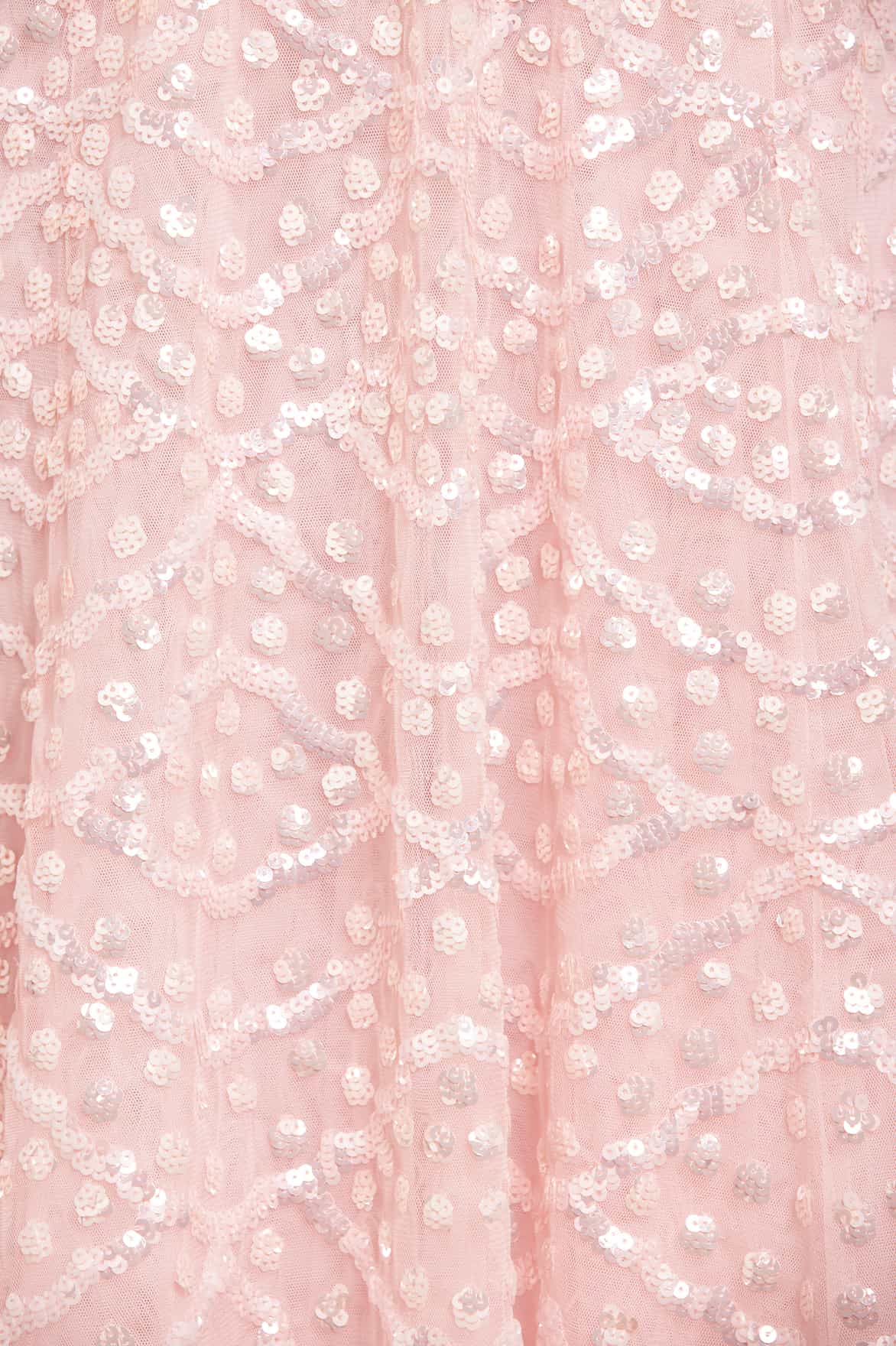 The Deco Dot Gloss Ankle Gown in Peony Pink. This style has an artwork inspired by 1930’s art deco styling. Developed with layered tulle sleeves and a sequin border edge for 1930’s romantic styling. The perfect gown for an upcoming special occasion.