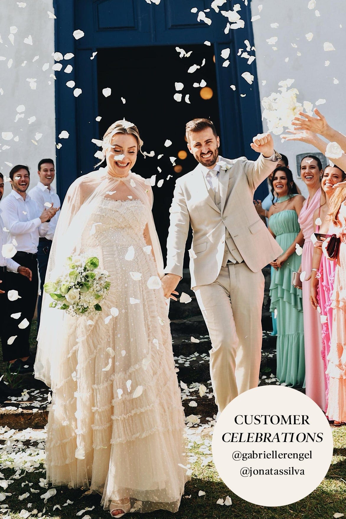 The Dot Shimmer Tiered Strapless Ankle Gown in Cream. This romantic dress features delicate sequins in a polka dot motif creating a shimmering effect throughout. The silhouette is adorned with double-stitched ruffles, giving it a frothy, romantic texture. The voluminous skirt is made from layers of tulle and net, creating a sweeping hemline with dramatic movement. Crafted from our signature textured kisses tulle and includes an integrated corset for the perfect shape and structure.