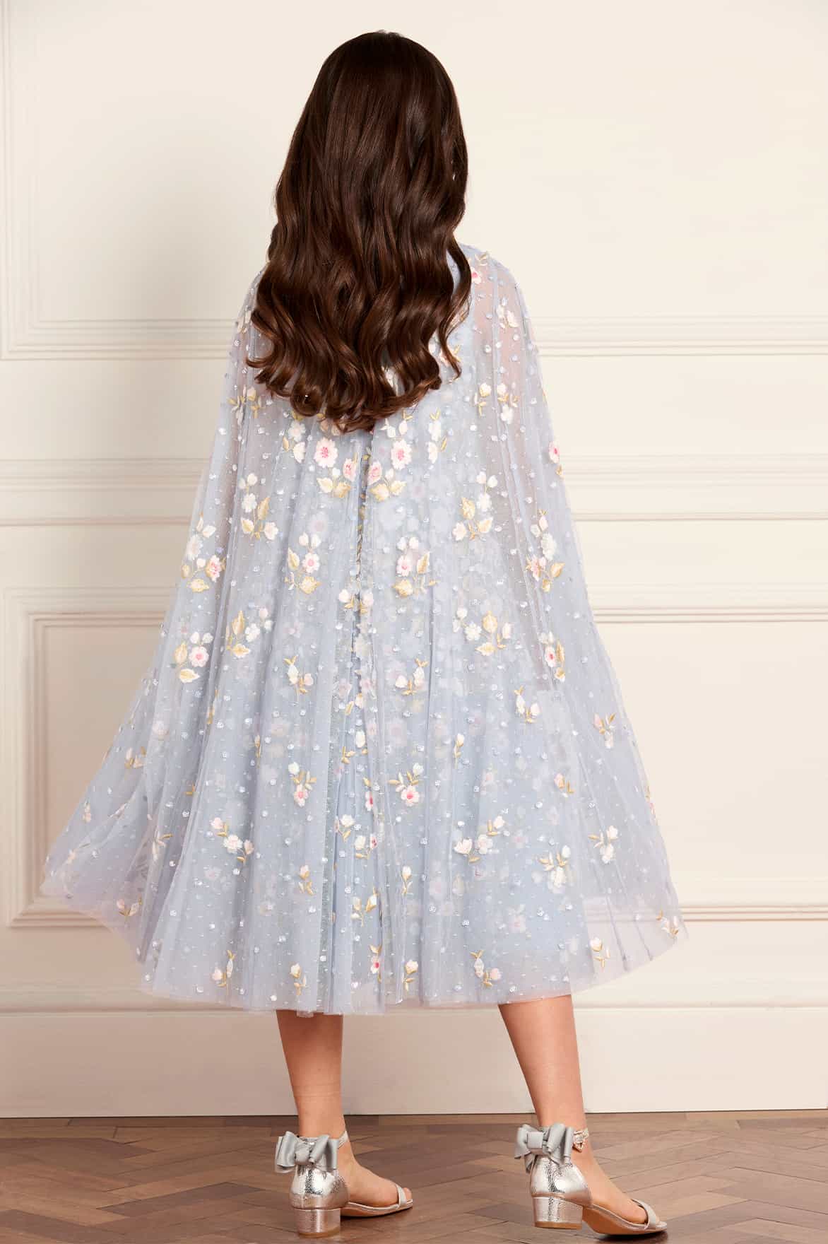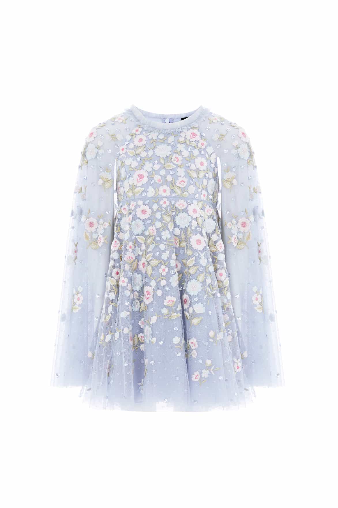 NEW SEASON. The Ethereal Blooms Cape Kids Dress in Skylight/Multi. Showcases delicate embroidery inspired by meadow blooms. With a fluttering cape and airy layers, this gown captures lightness and elegance. This style complements the Ethereal Blooms Frill Ankle Gown from the womenswear line for a soft, coordinated look.