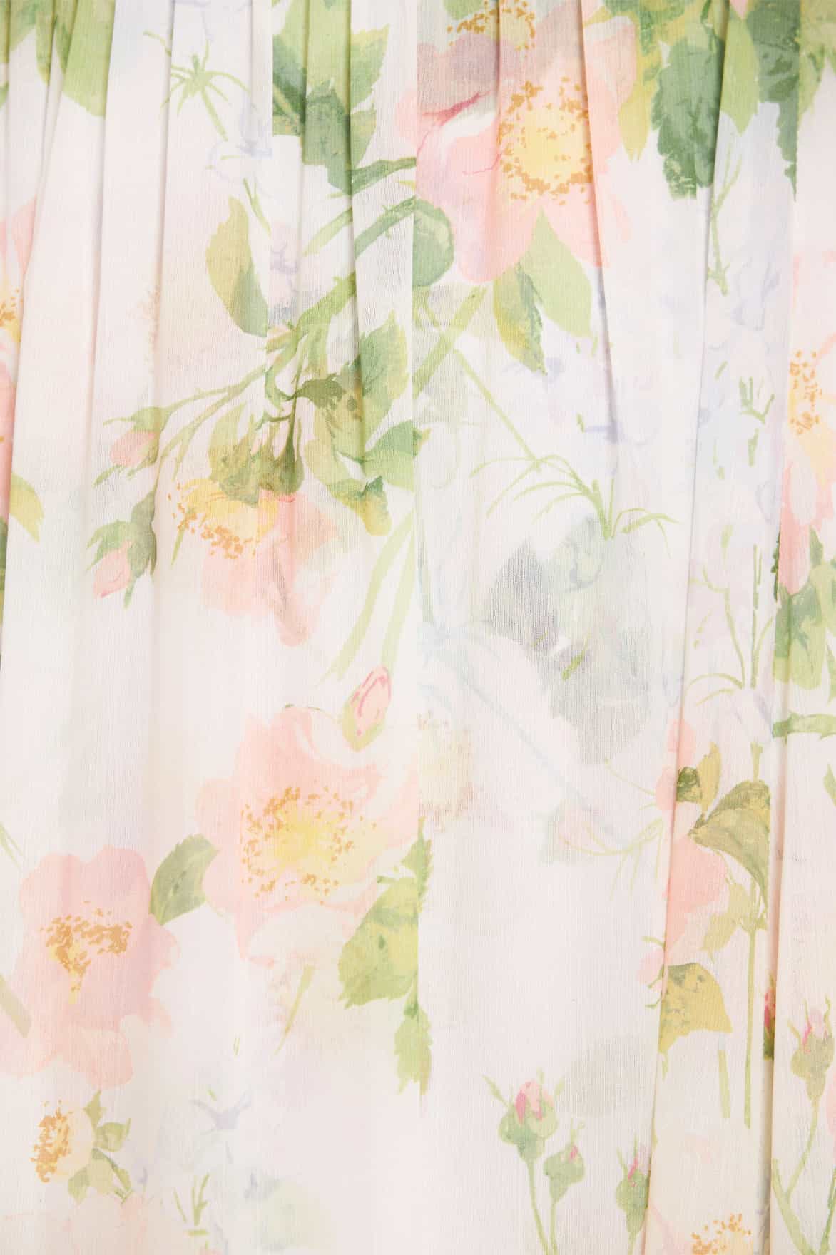 The Immortal Rose Harper Chiffon Cape Ankle Gown in Moonshine. This beautiful gown features a romantic print captured from an antique, hand-painted artwork from the early 1900s. Decorated with wild rose motifs in soft pink shades intertwined with green foliage. This gown features a dramatic yet elegant cape which has a detachable fastening for versatile styling. Developed in the softest chiffon for a romantic flowing silhouette. The perfect gown to take you from day to night.