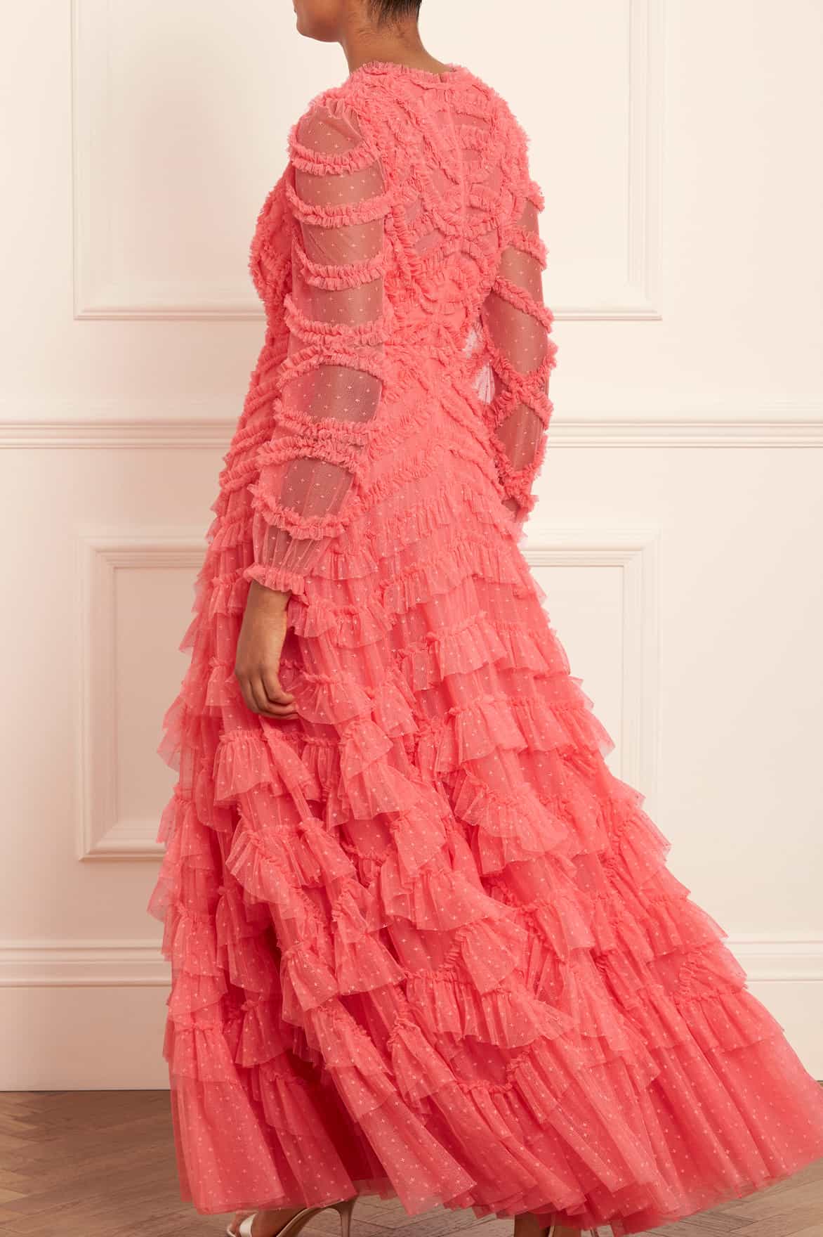The Lana Round Neck Gown in Pink Sky. This beautiful gown is adorned and engineered with tulle frills to create a romantic textile. Developed with a round neck design and long sleeve for an elegant look. Beautifully crafted with layers of soft tulle for a whimsical, statement texture. Expect all eyes on you in this magical Needle & Thread piece.