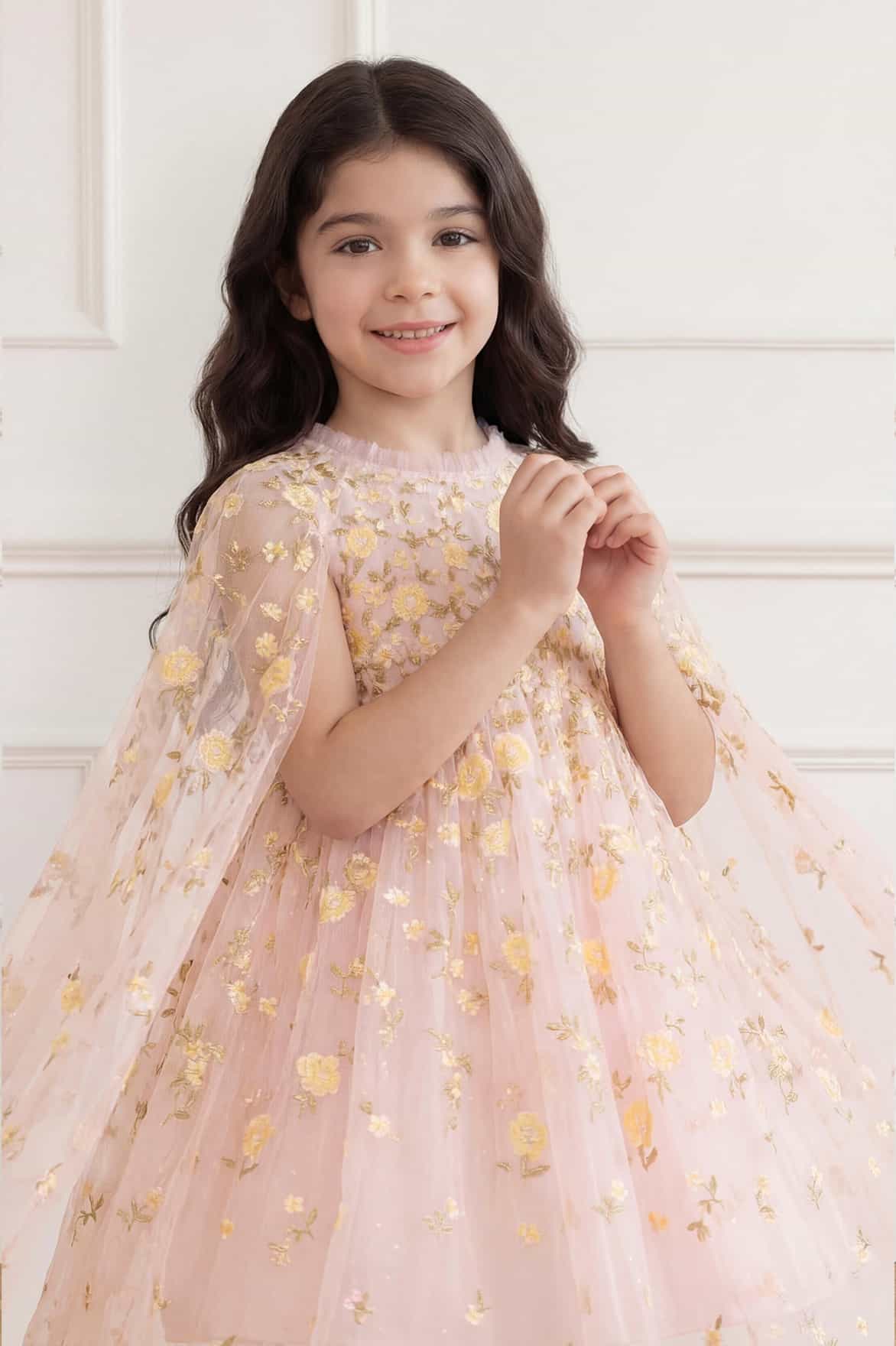 NEW SEASON. The Lea Ditsy Cape Kids Dress in Peony Pink/Lemon Sorbet. This enchanting kids dress features a flowing cape detail and a multi-layered skirt that moves beautifully. Finished with delicate ditsy florals inspired by painted garden scenes, it’s both comfortable and luxurious. Thoughtfully designed to complement the coordinating Lea Ditsy styles in the women’s collection.