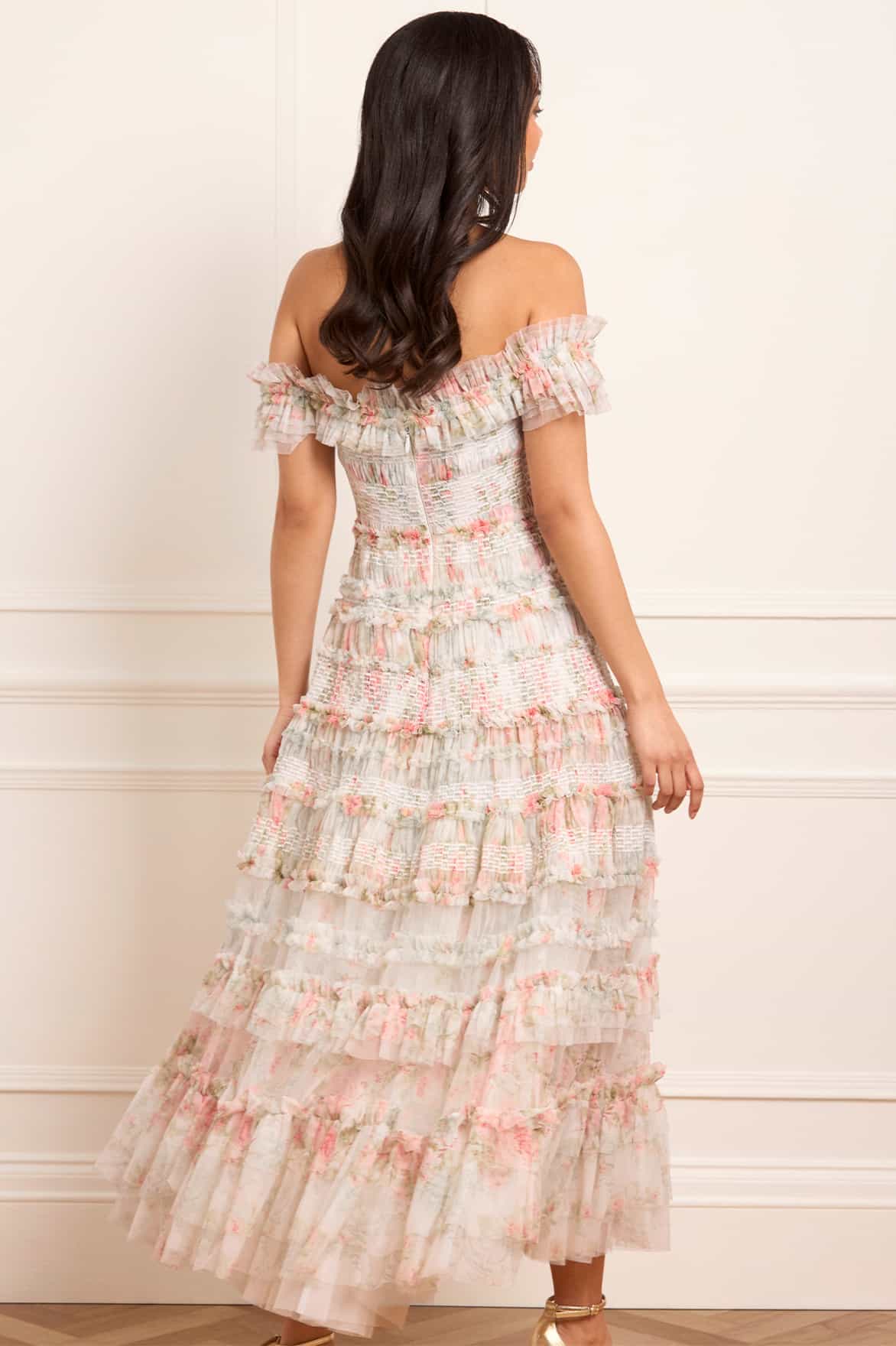 NEW SEASON: The Madame Rose Elodie Off-Shoulder Ankle Gown in Moonshine. This luxurious gown features an archive-inspired rose print, with an off-shoulder neckline framed by layers of gathered ruffles for a romantic, frothy effect. The linear smocking design, intricately embroidered and interspersed with signature Needle & Thread tulle frills, graduates beautifully towards the sweeping hem, enhancing the gown's stunning silhouette. The skirt, crafted from layers of delicate net and tulle, flows with graceful movement. An internal stretch power-mesh corset provides exceptional comfort and fit, while soft boning, encased in grosgrain ribbon, adds exquisite couture detailing. Elastic trim and adjustable hook-and-eye fastenings ensure a versatile and perfect fit.