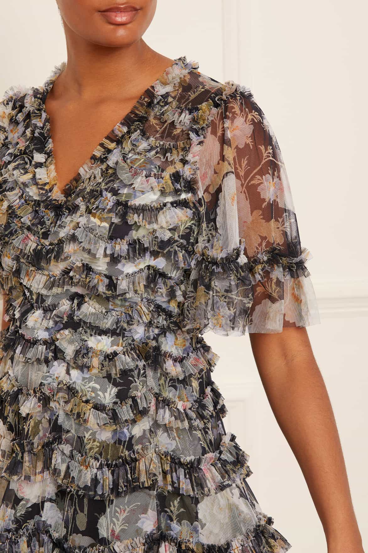 The Moonlight Petals V-Neck Ballerina Dress in Graphite. The print of this dress is taken from a 1900's hand-painted artwork. Beautifully printed with soft white peonies and silvery blue wildflowers creating an enchanting print. Crafted with signature Needle & Thread detailing featuring delicate tulle frills, scallop shape borders and frills creating romantic texture throughout. You can dress the Moonlight up or down depending on the occasion.
