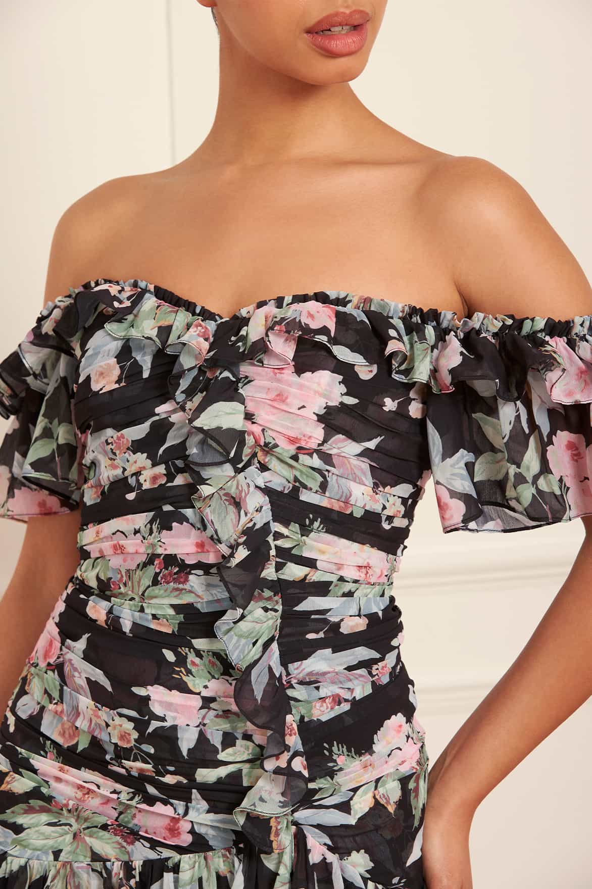 - Floral printed chiffon decorated with chiffon ruffles