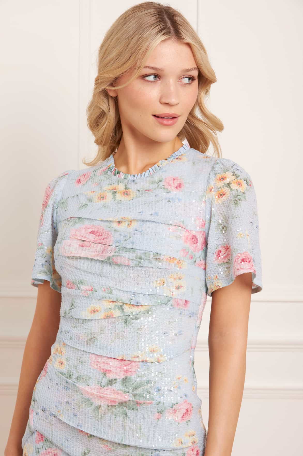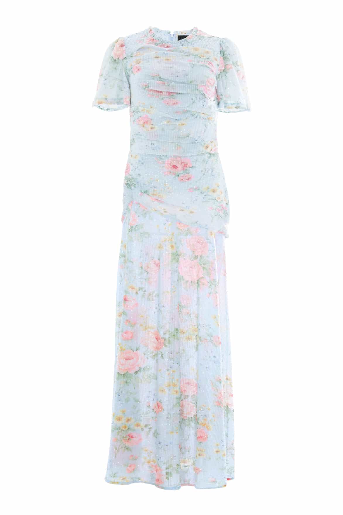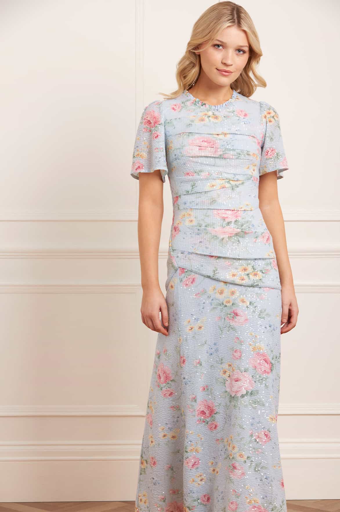 The Pompadour Garden Sequin Gown in French Blue. Inspired by the opulent wall coverings of the Palace of Versailles, this gown features luxurious hand-painted floral bouquets and trailing ditsy motifs. Crafted with tiny clear sequins delicately applied for a transparent, shimmering effect. The slim silhouette is beautifully draped, flattering the body, while the fluid, sweeping skirt adds movement. Short sleeves complete the refined, elegant look, making this gown a true statement of luxury and craftsmanship.
