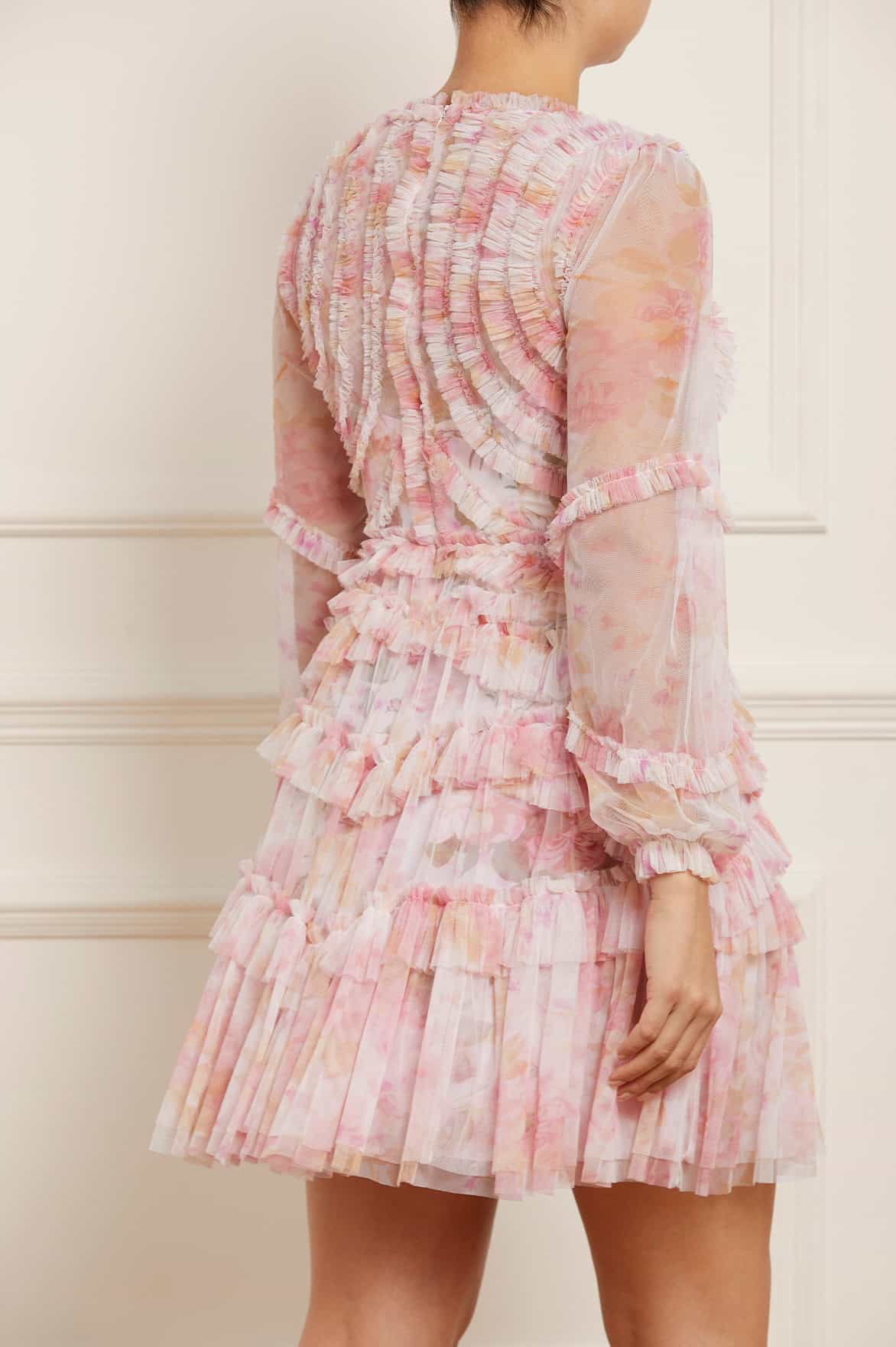 The Rose Bluebell Ruffle Mini Dress in Moonshine. Beautifully designed with a whimsical print of soft pink roses with delicate bluebells, taken from an 1800s hand-painted floral artwork. This signature Needle & Thread style is crafted with voluminous cuffed sleeves and a flattering skirt that skims the body and gradually increases in fullness, creating stunning movement as you walk. This Victorian-inspired look with a contemporary edge will be the star of your wardrobe.