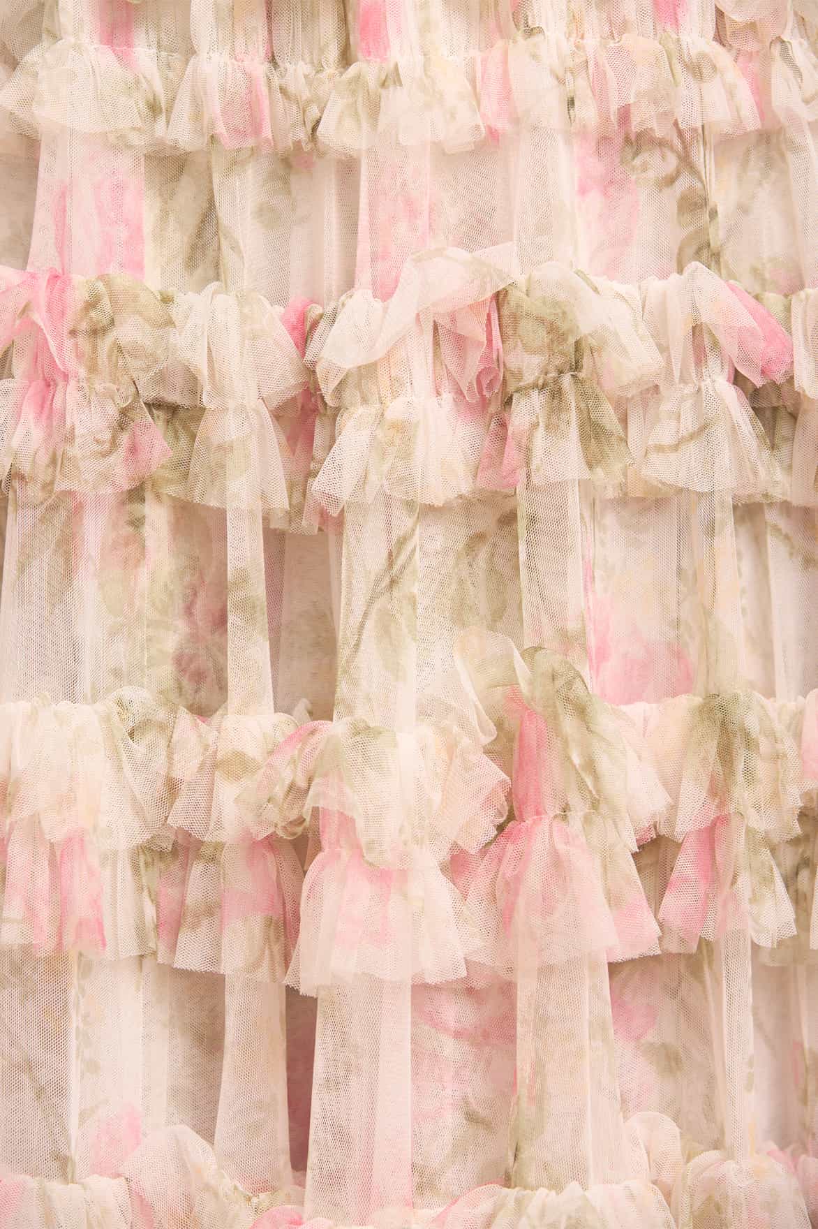 - Floral printed tulle decorated with layers of tulle ruffles.