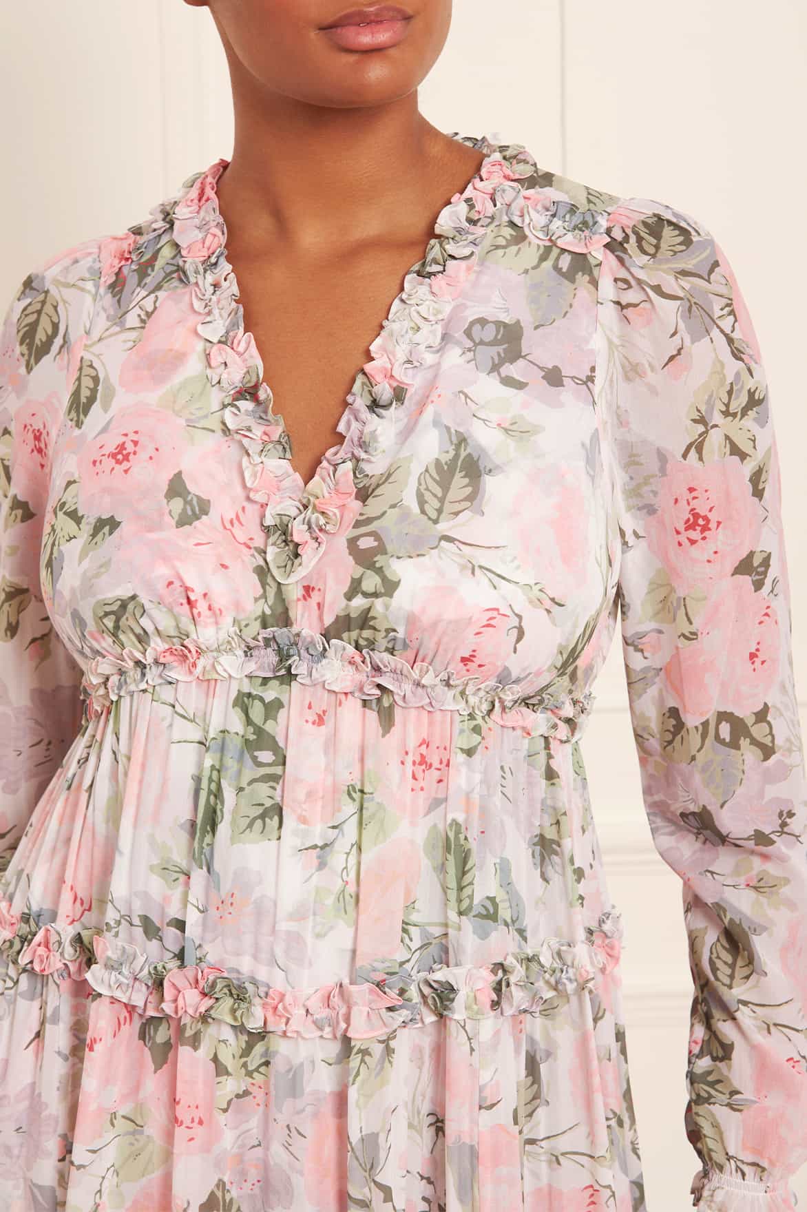 The Rose Powder Chiffon Ankle Gown in Moonshine. This gown is inspired by a 1900s hand-painted wallpaper design. Beautifully printed with florals in faded pastels for a vintage look. Developed with a soft chiffon fabric with a loose fitting silhouette for effortless styling. Designed with an upwards V-shaped waistline to create a flattering fit, gathered ruffles and skirt tiers for a signature Needle & Thread look. A versatile piece you'll forever cherish.
