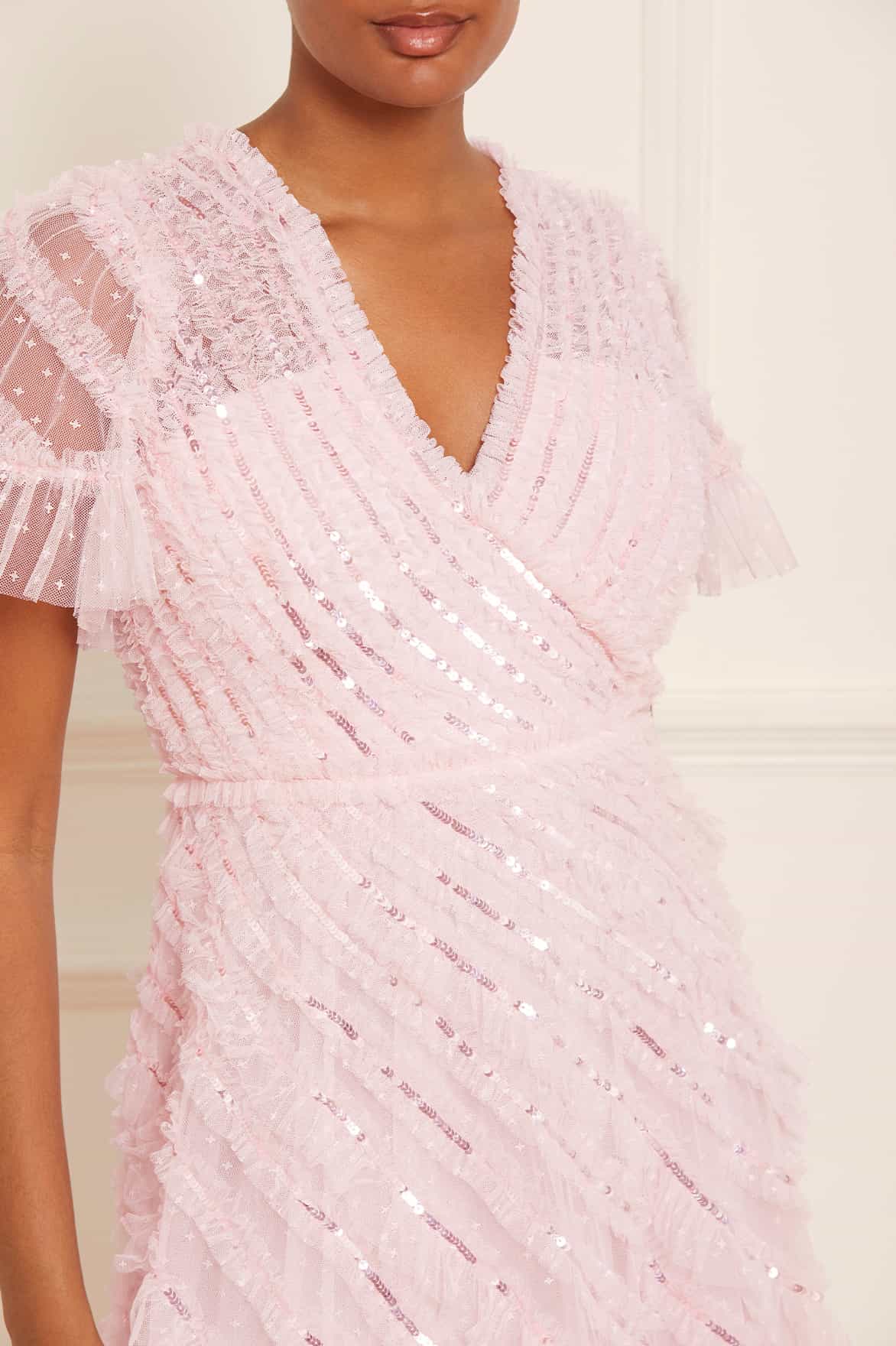 The Spiral Sequin V-Neck Ankle Gown in Peony Pink. A brand new style for the season ahead. This gown is a true statement piece, featuring all over frothy texture to create a signature Needle & Thread look. Beautifully engineered with gathered, spiral texture and intricate, shimmering sequins adorning each individual frill creating an enchanting effect. Make an appearance in this romantic style.