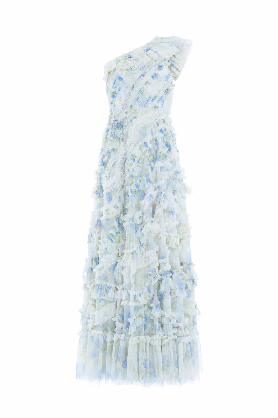 The Summer Posy Aaliyah One-Shoulder Ankle Gown in Moonshine. The print of this dress is taken from a 1930’s hand-painted wallpaper design. The artwork features a series of powder blue posies scattered in a soft formation. Designed with intricate, gathered frills featuring undulating, wave like borders. Developed with a one-shoulder design with layered soft tulle ruffles along the neckline to create a statement silhouette. The skirt is made from generous layers of net and tulle for a sweeping hemline. Expect all eyes on you in this romantic gown.