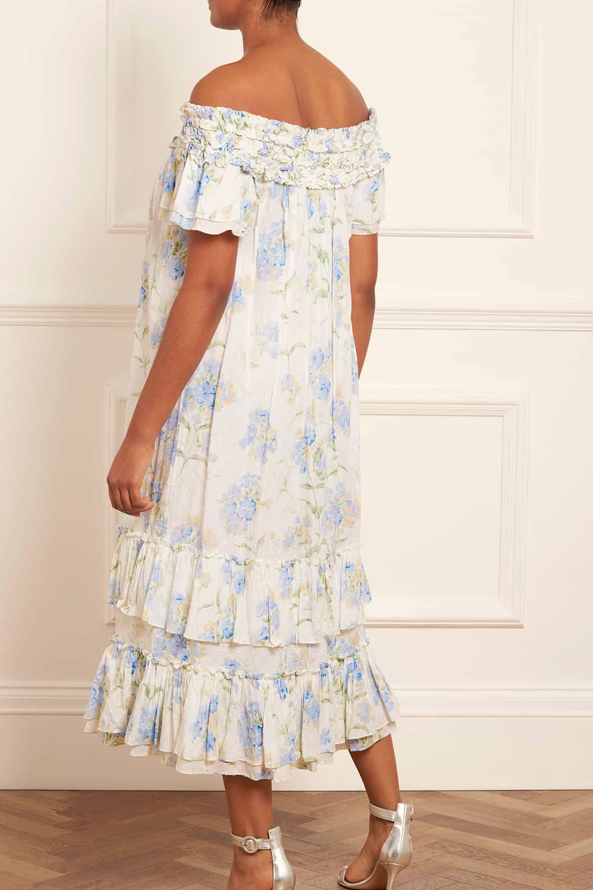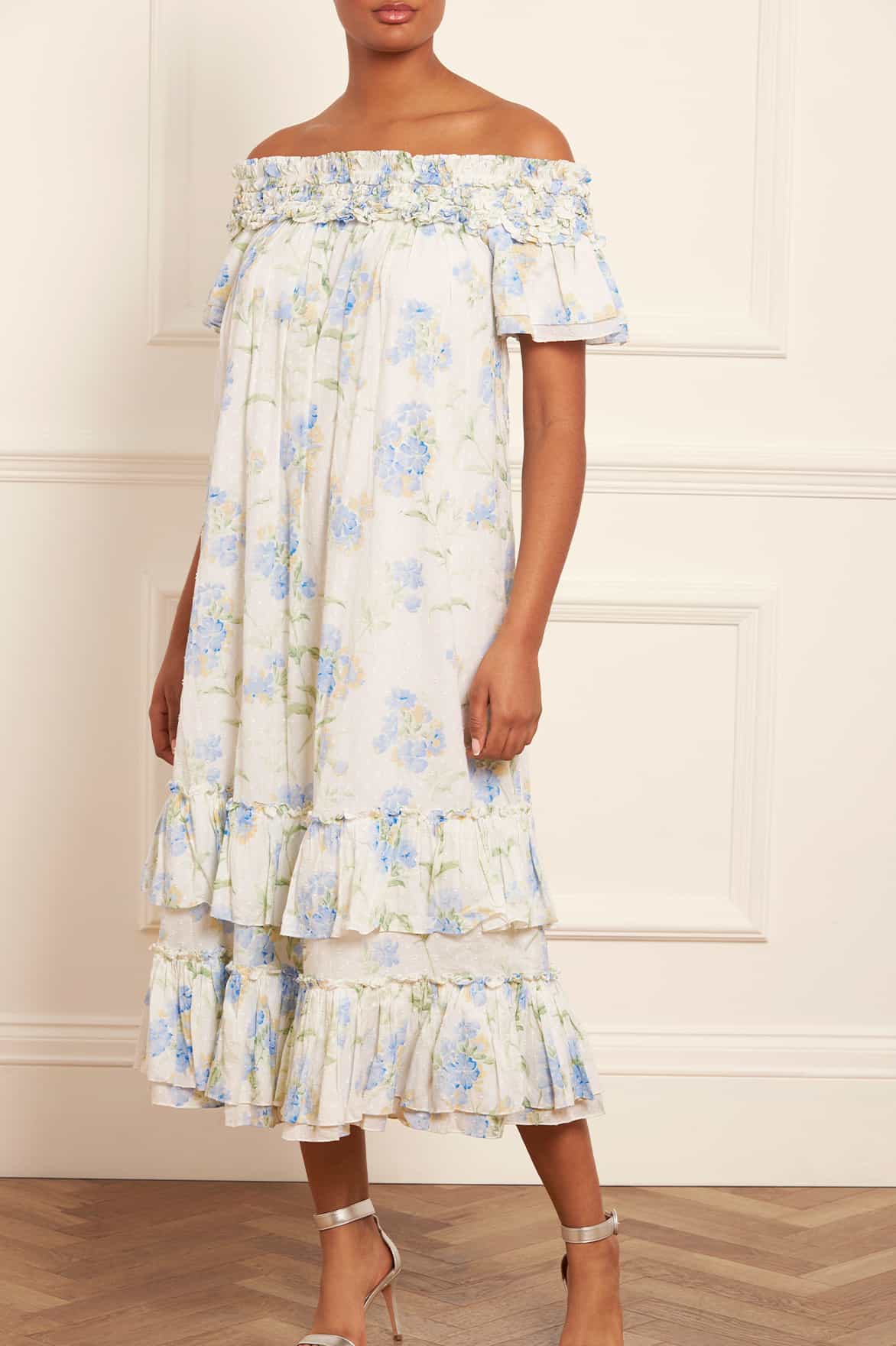 The Summer Posy Cotton Off-Shoulder Ankle Gown. The print of this dress is taken from a 1930’s hand-painted wallpaper design. The artwork features a series of powder blue posies scattered in a soft formation. This ankle gown features an off-the-shoulder design with ruffles creating an effortless Needle & Thread textile. Developed from soft, organic cotton with a loose, easy-fit texture for versatile styling. The perfect wardrobe staple.
