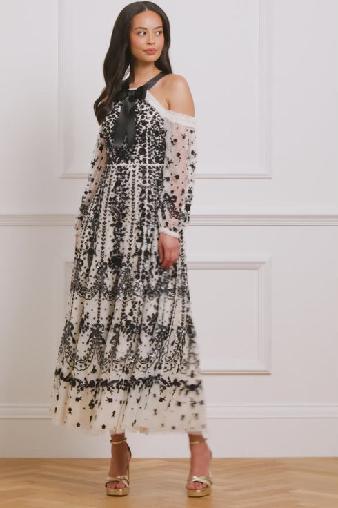NEW SEASON. The Adeline Off-Shoulder Ankle Gown in Cream/Graphite. A dramatic take on evening elegance. Delicately embroidered with Victorian-era inspired florals, bows and scallops in contrast graphite thread, this off-shoulder silhouette embraces romance with a contemporary twist. Shimmering sequin embellishments enhance the flattering fitted bodice, while the ankle-length skirt flows into a cascade of softly glinting florals.
