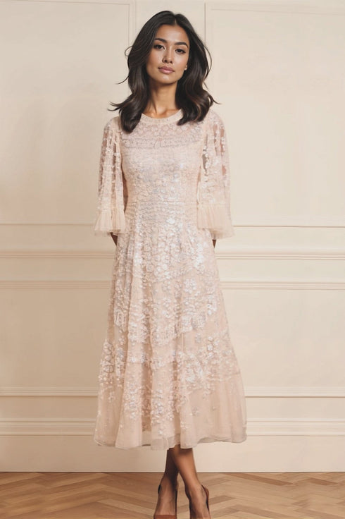 NEEDLE & THREAD EXCLUSIVE. The Anais Sequin Ballerina Dress in Cream/Dusk Pink. This beautiful statement style is inspired by charcoal drawings of vintage French lace from the early 1900s. This shimmering sequin dress features a dense border design, creating a lustrous effect. Designed with a romantic fluted sleeve featuring a deep gathered frill at the cuff for ethereal styling. The neckline and shoulders are adorned with signature Needle & Thread tulle ruffles. This is one of Needle & Thread's heritage pieces from the archive - A signature timeless piece.