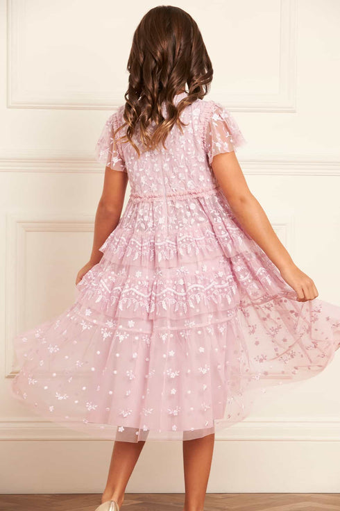 The Angelica Lace Kids Dress in Misty Lilac. This enchanting dress combines vintage-inspired elegance with playful charm. Delicate, intricate embroidery, reminiscent of classic Victorian lace trims, adorns the bodice, while soft tiered frills bring a touch of whimsy and movement. Crafted to capture timeless beauty, this dress is the perfect addition to your little one’s wardrobe—ideal for special occasions and everyday magic.