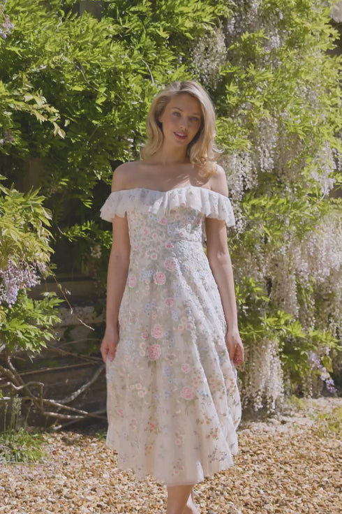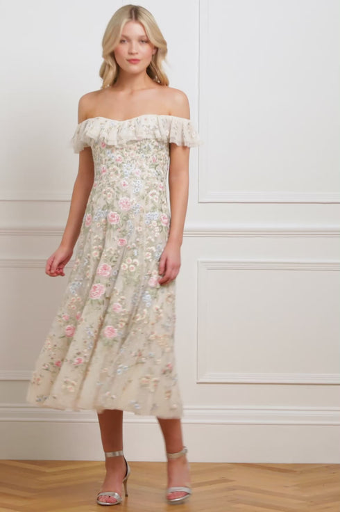 The Antoinettes Floral Off-Shoulder Ballerina Dress in Cream. Inspired by the grandeur of Versailles, this ballerina dress features delicate, multicoloured floral embroidery trailing elegantly to the hem. The off-shoulder neckline is framed with playful circle-cut frills, while layers of soft net and tulle create a full, floaty skirt with a sweeping finish. A magical blend of romance, drama, and fairytale charm.