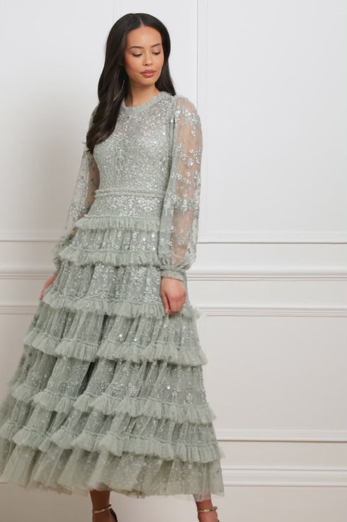 The Blossom Lace Ankle Gown in Laurel. A statement gown full of timeless elegance. Designed with a voluminous silhouette and cascading layered frills, this gown is adorned with delicate embroidery and subtle clear sequins that catch the light with every movement. A structured net layer adds definition, enhancing the gown’s dramatic shape. A truly show-stopping piece, perfect for unforgettable moments.