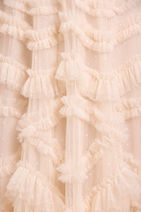 The Bronte Off-Shoulder Gown in Cream. This beautiful gown features an exquisite textile meticulously developed in 3D by the designer, directly onto the mannequin. Beautifully developed with romantic, frothy frills arranged in intricate scallops and oval designs that gracefully adorn the bodice and skirt. The statement off-the-shoulder dress has a flattering curved neckline and straps, decorated with signature Needle & Thread soft tulle ruffles. The fluted sleeves are decorated in frothy tulle ruffles and trimmed with gathered frill tiers at the cuff. The silhouette is exceptionally flattering, with a fitted bodice that flows into a generous skirt made up of layers of net and tulle, culminating in a sweeping hemline that ensures a breathtaking entrance.