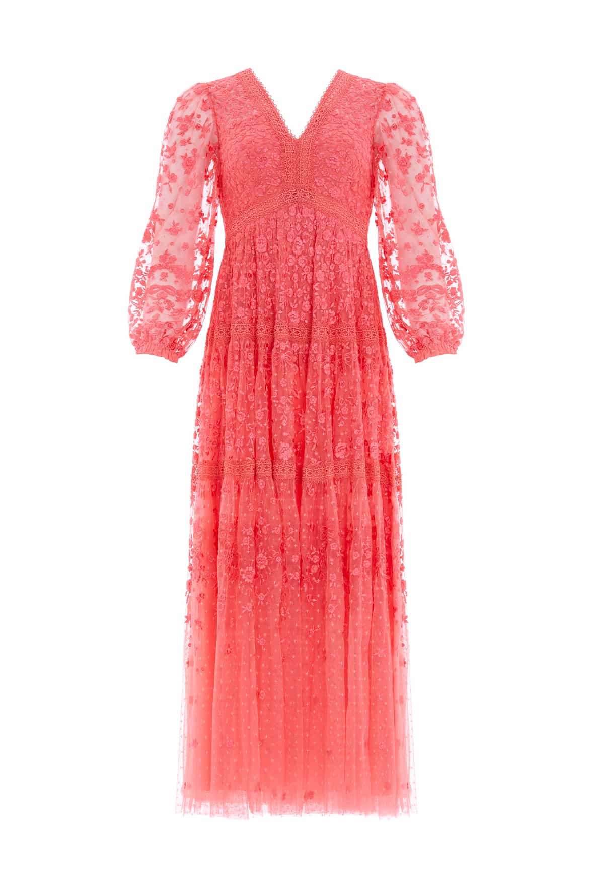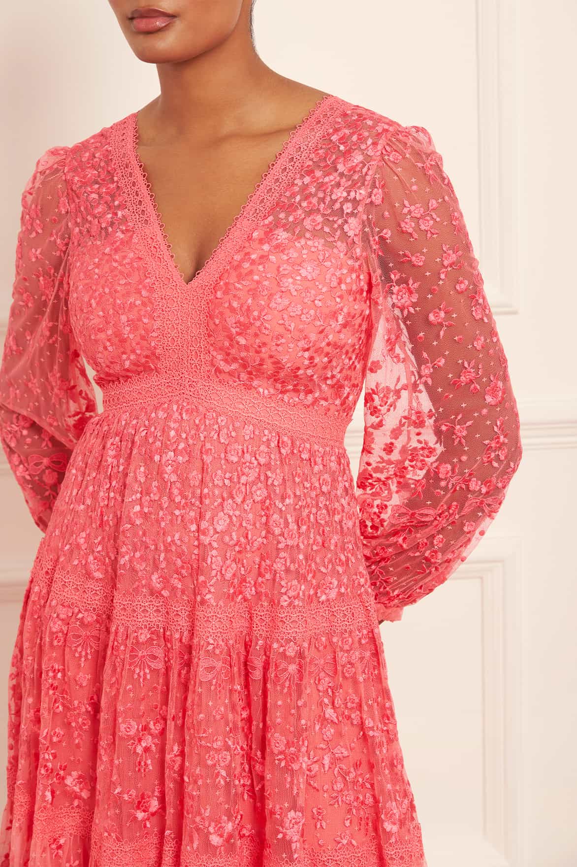The Celestia Ribbon Ankle Gown in Sky Pink. This gown has been intricately designed with rich embroidery inspired by vintage lace, featuring delicate floral motifs and ribbon bows throughout. Crafted with pretty lace trims for signature Needle & Thread detailing, and delicately constructed with a textured tulle fabric base. Featuring a V-shaped neckline and a new, ultra-flattering silhouette. Make the ultimate statement in the Celestia.