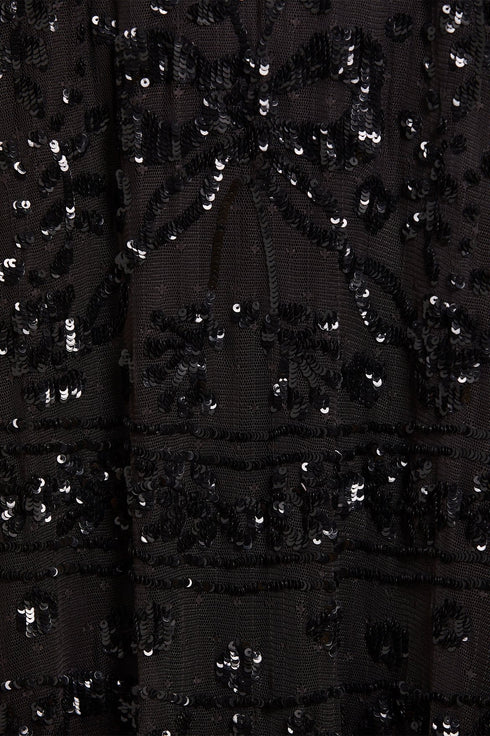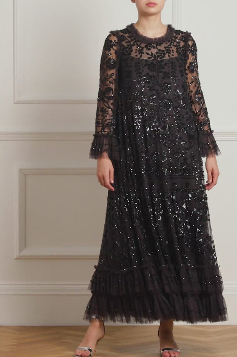 The Celia Long Sleeve Ankle Gown in Graphite. This statement gown is designed with romantic artwork featuring ornate florals, ribbon bows densely filled with shimmering sequins and exquisite detailing. Crafted to produce an effortless, loose fit with soft, playful tulle frills on the hem and cuffs. A key piece in our collection.