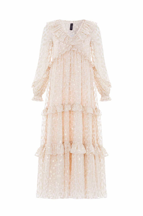 NEW SEASON. The Cherie Lurex Ankle Gown in Opal. A subtly sparkling style, crafted from fluid georgette with metallic lurex thread. With a softly gathered silhouette and romantic long sleeves, this gown glimmers gently as it catches the light. An elegant option for unforgettable moments.