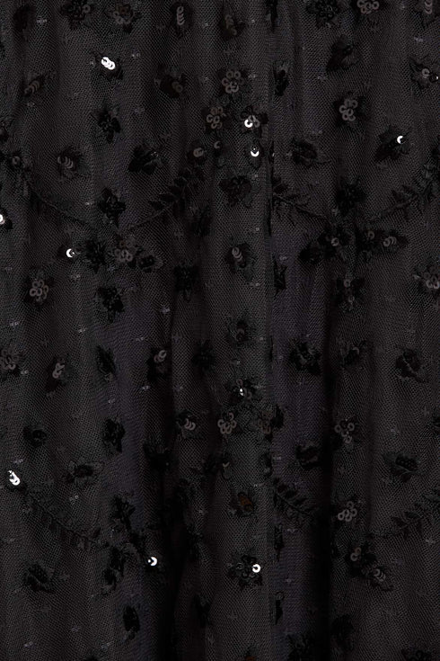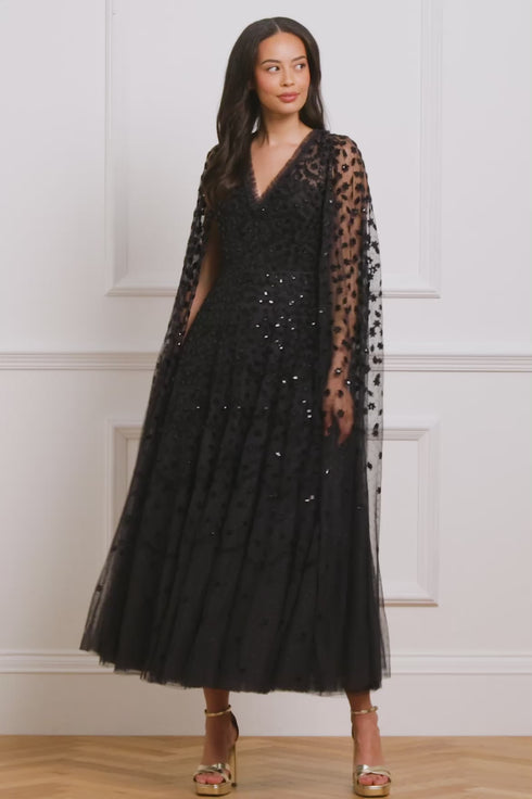 NEW SEASON. The Clover Cape Sleeve Ankle Gown in Graphite. A romantic silhouette inspired by vintage lace designs from the early 1900s. Adorned with delicately embroidered ditsy florals and scalloped foliage motifs, the gown features soft cape sleeves for an ethereal touch. The embroidery gradually widens toward the hem, dissolving into swirling floral patterns for a soft, whimsical finish. A perfect choice for seasonal events and graceful occasions.