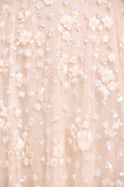 - Kisses tulle decorated with floral embroidery and sequins